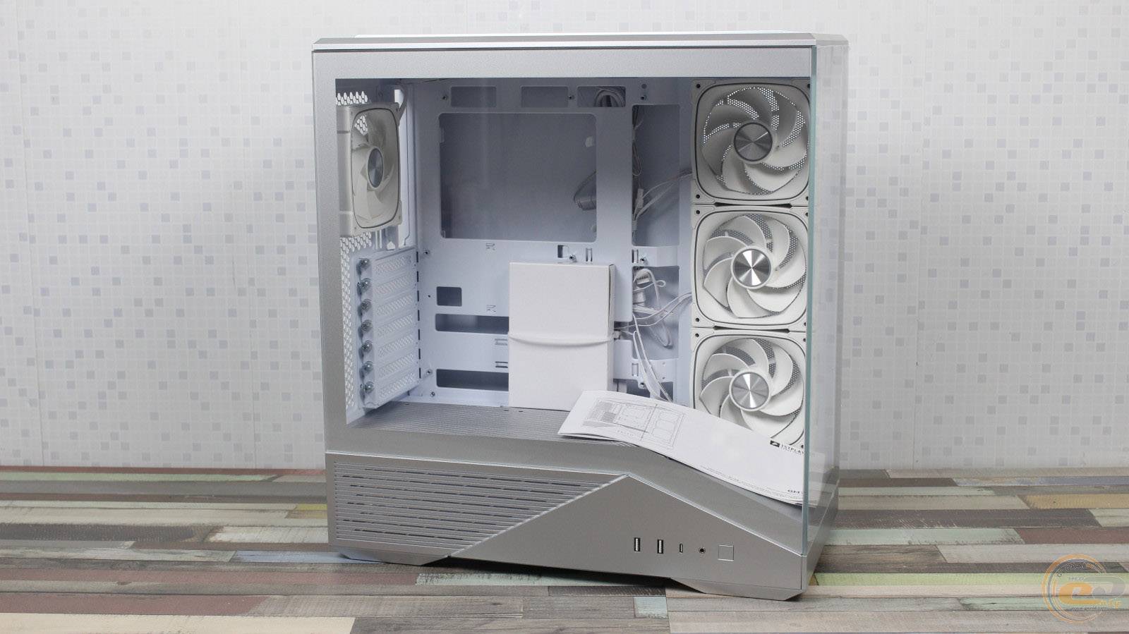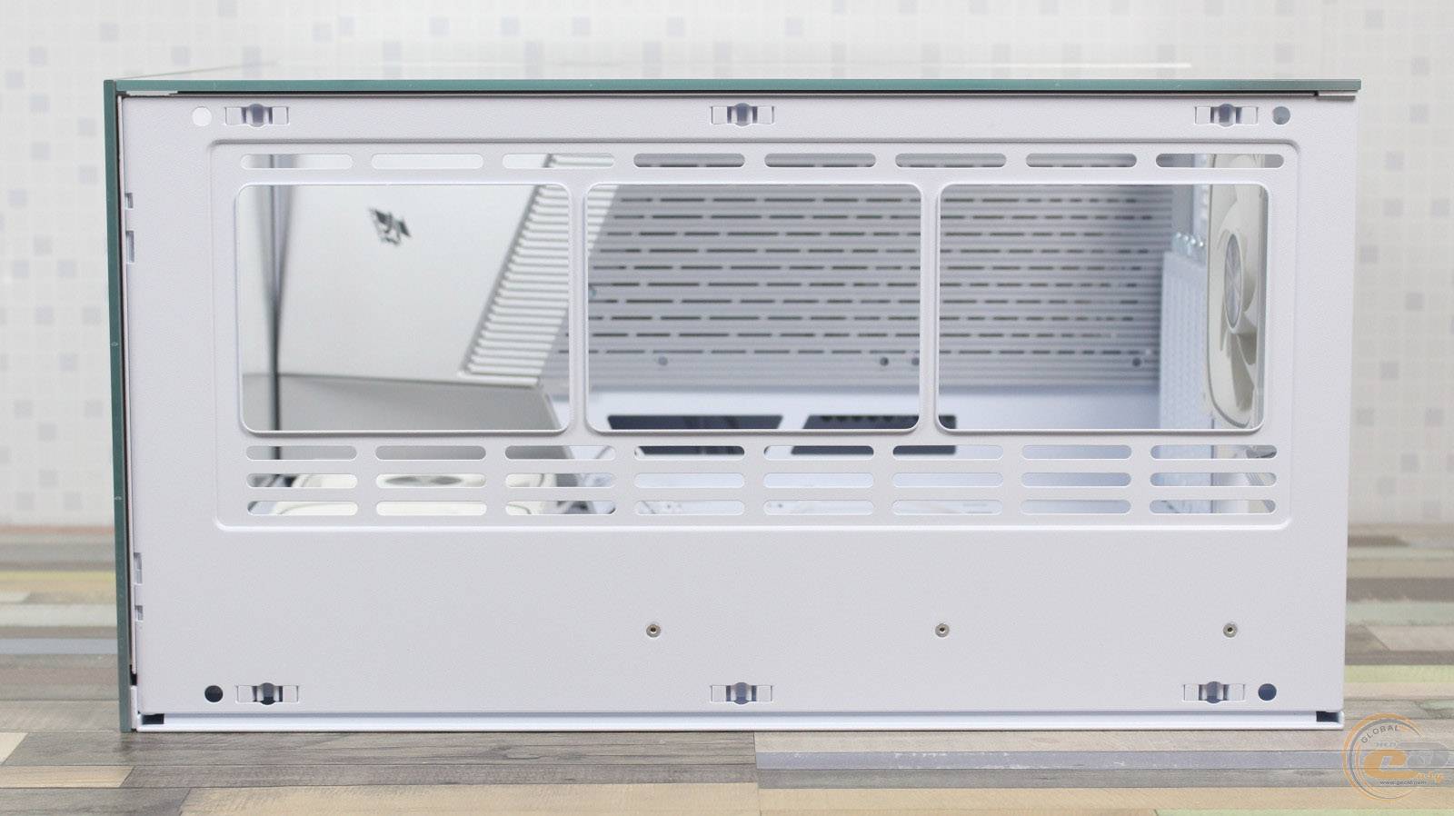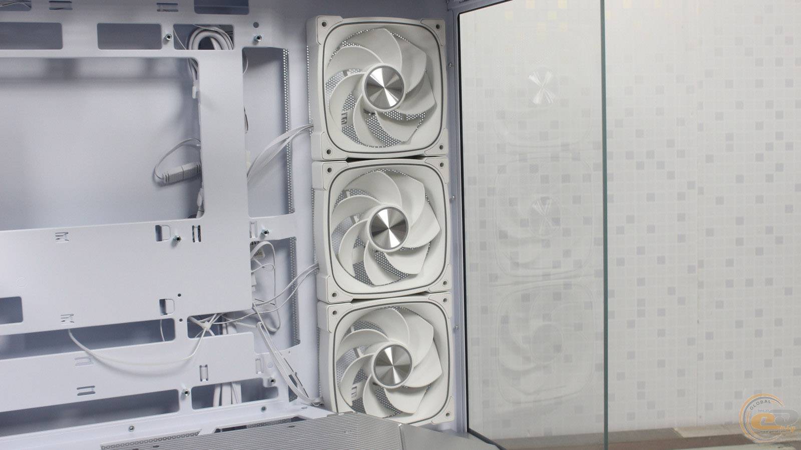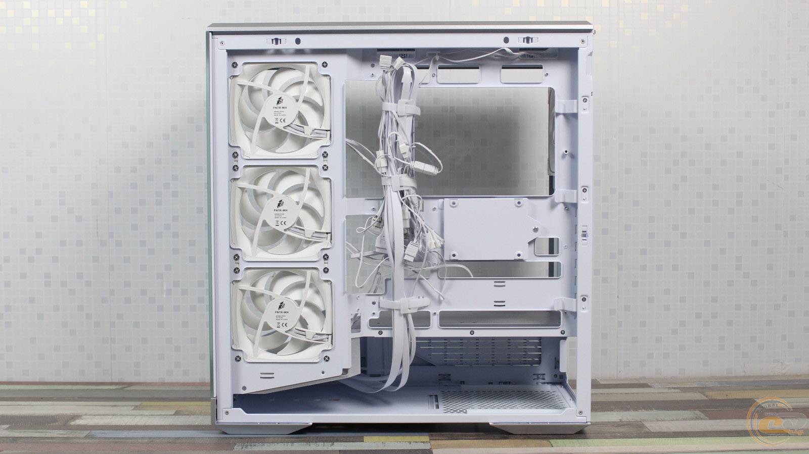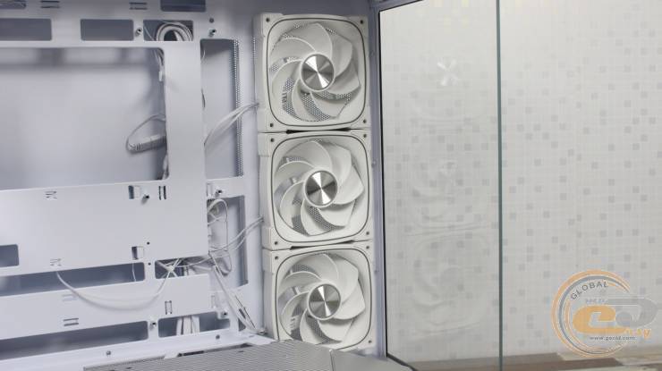 На панелі біля материнської плати розташовані три 120-мм семилопатеві вентилятори 1STPLAYER FN7R-WH із реверсивними лопатями. Вони підтримують ШІМ-регулювання швидкості обертання в діапазоні 600–1800 ± 10% об/хв і мають максимальний рівень шуму до 31,28 дБ(А). Потік повітря досягає 38,39 CFM (65,22 м³/год). Установка 140-мм моделей або РСО у цьому місці неможлива через обмежений простір.