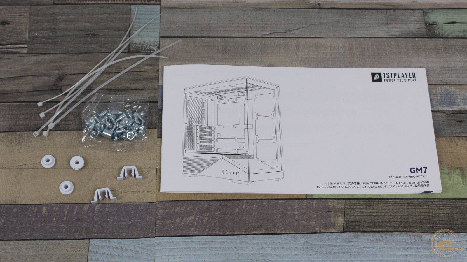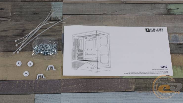 Схоже, що паковання із простого картону з сіро-чорним оформленням є однаковим для усіх модифікацій 1STPLAYER GM7. Згідно з інформацією на одній із боковин, існують також версії корпуса без встановлених вентиляторів.