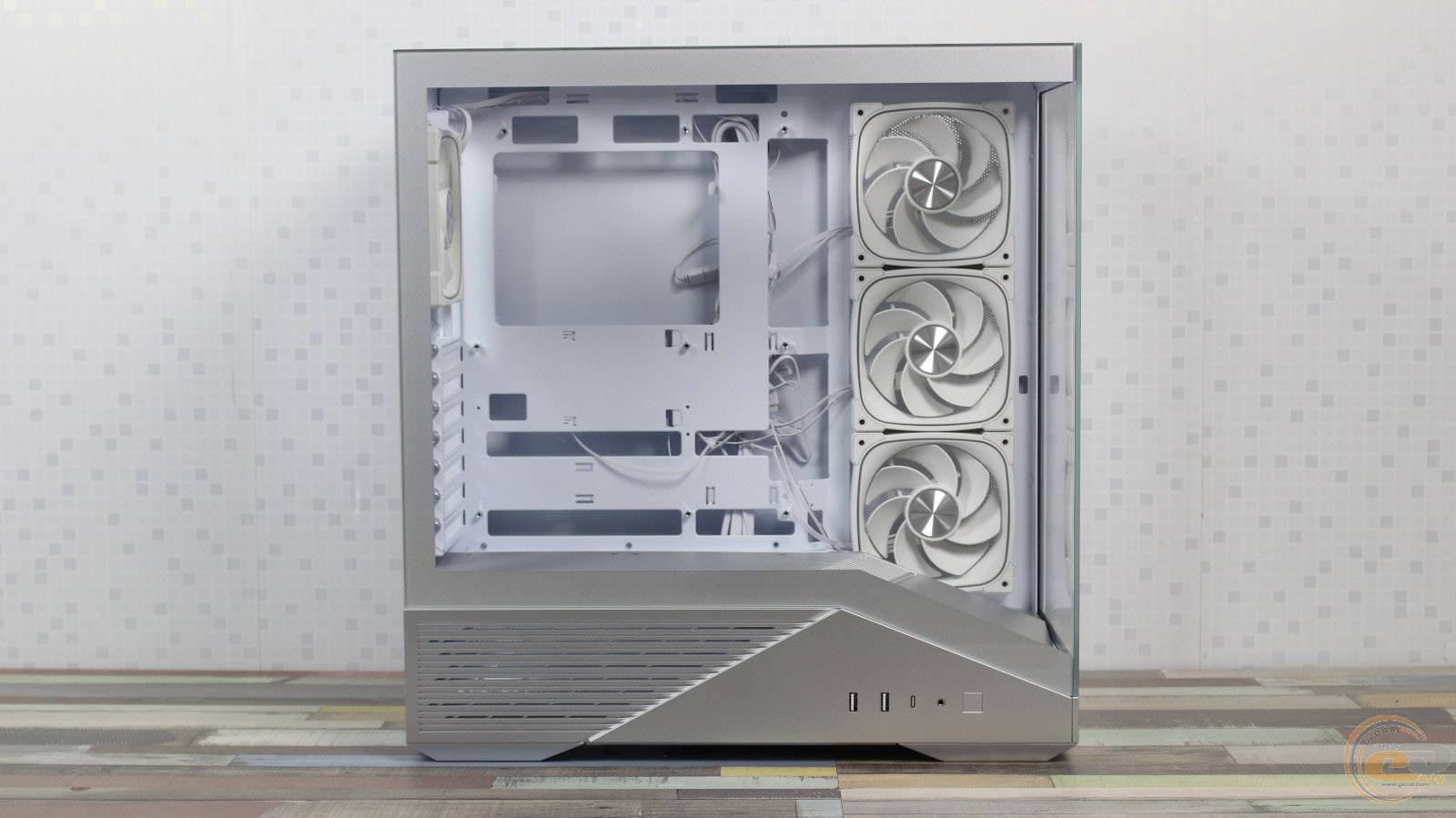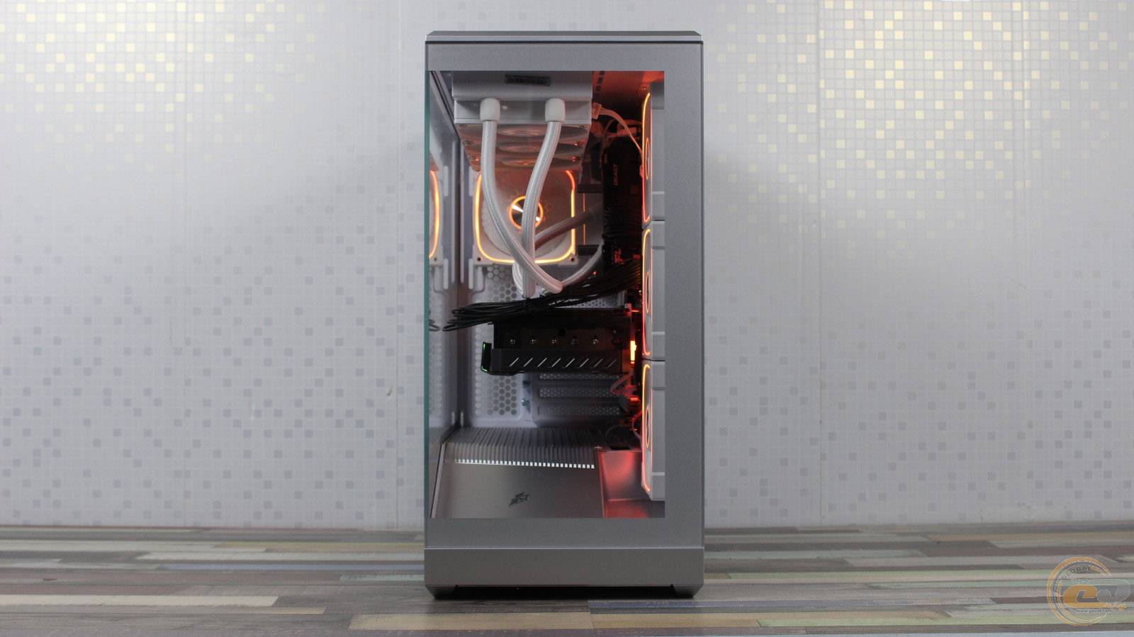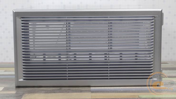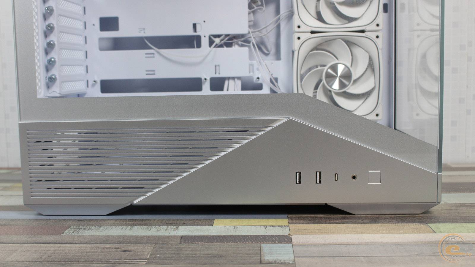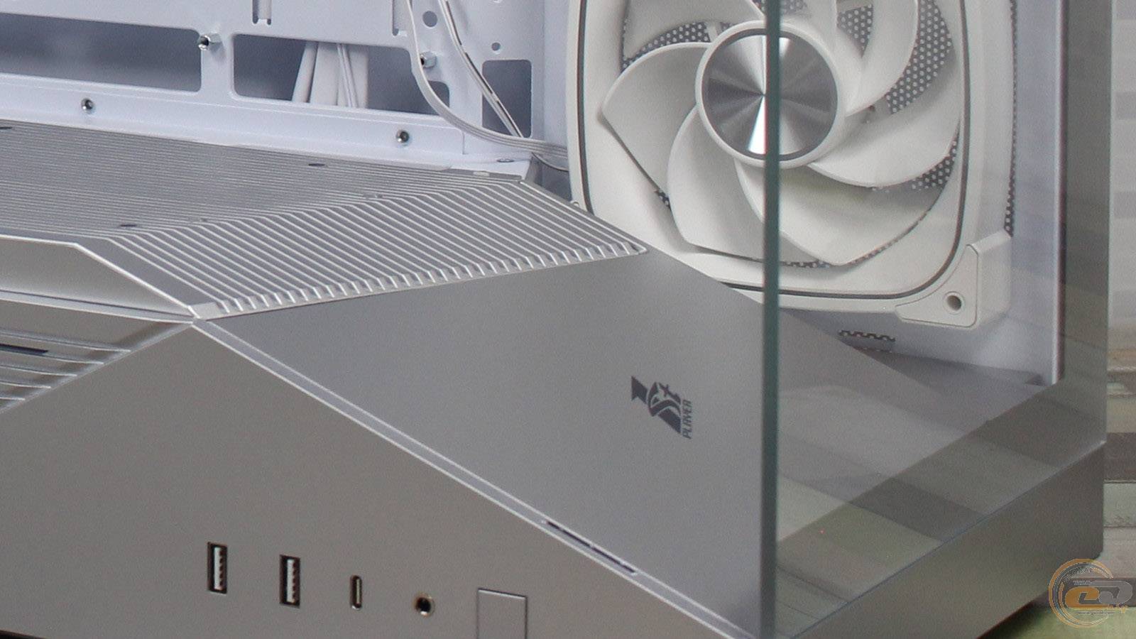 1STPLAYER GM7 виглядає значно дорожчим, ніж він є насправді, і повністю реалізує всі візуальні переваги «акваріумного» корпуса, при цьому залишаючись більш компактним та вужчим. Завдяки панорамним скляним панелям виробник подбав і про ефективну циркуляцію повітря всередині – наші тести показали, що комплектні вентилятори забезпечують мінімальну різницю температур компонентів у порівнянні з відкритим стендом. Якщо ж ви плануєте використовувати «гарячу» відеокарту, додаткові вентилятори на кожусі блока живлення стануть доречним доповненням: для цього на його боці передбачена перфорована зона для забору холодного повітря.