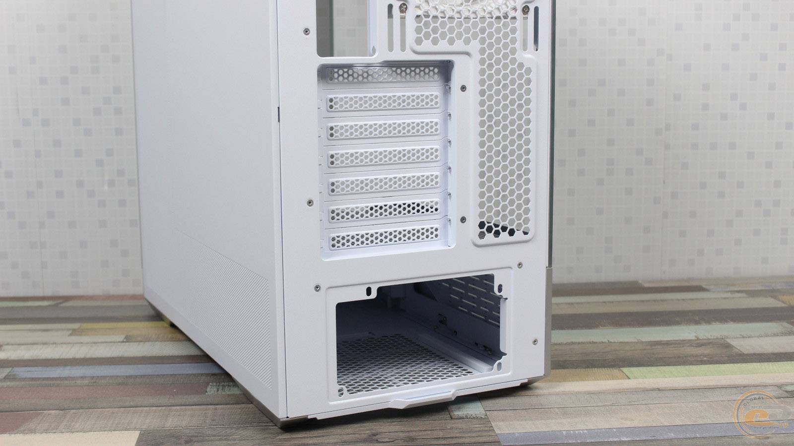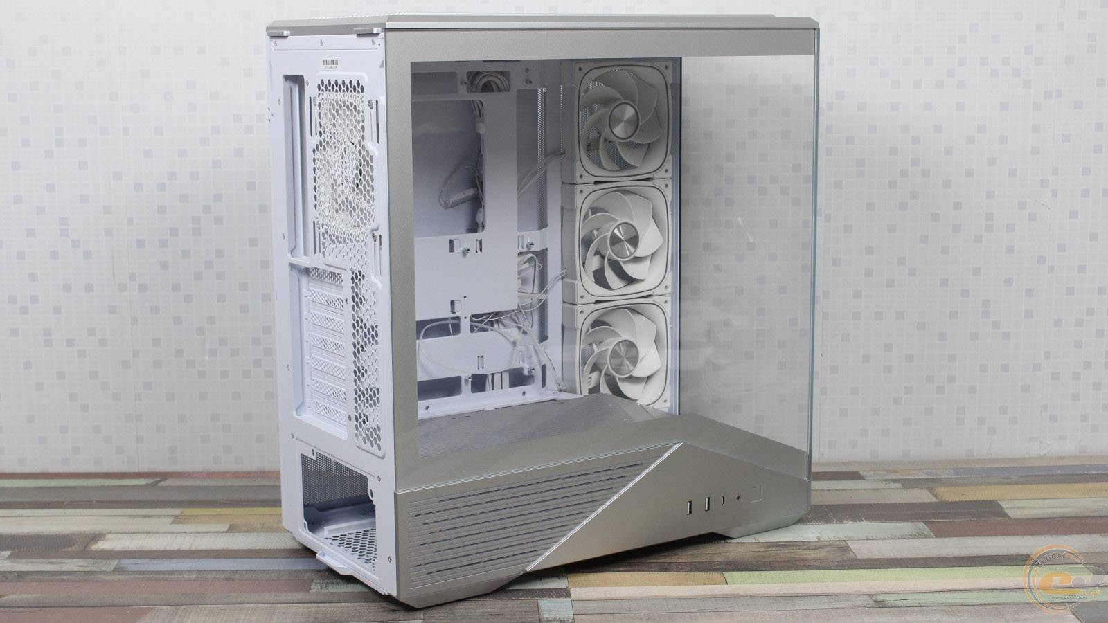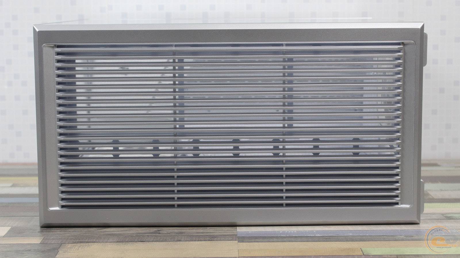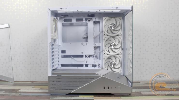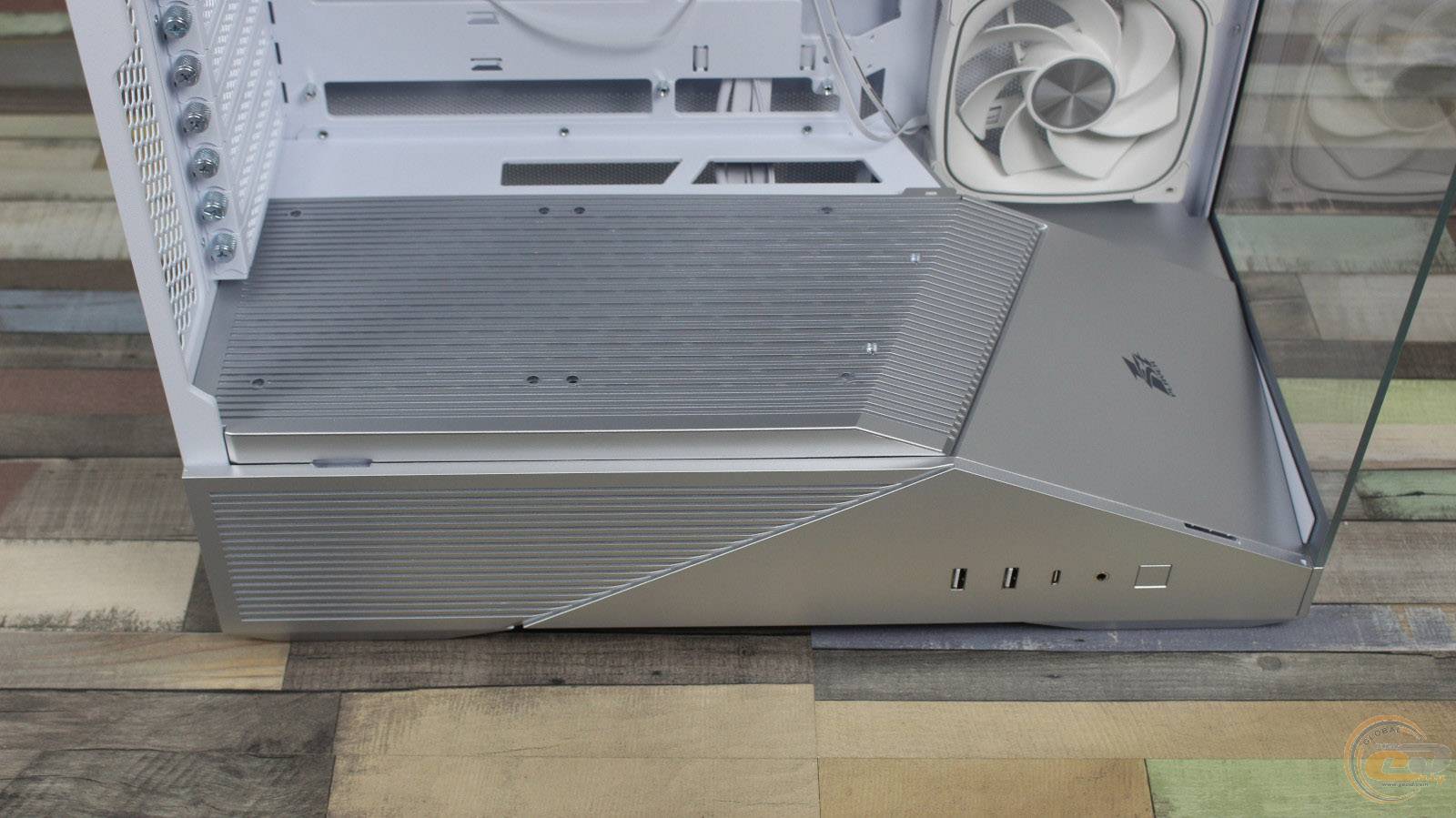 1STPLAYER GM7 виглядає значно дорожчим, ніж він є насправді, і повністю реалізує всі візуальні переваги «акваріумного» корпуса, при цьому залишаючись більш компактним та вужчим. Завдяки панорамним скляним панелям виробник подбав і про ефективну циркуляцію повітря всередині – наші тести показали, що комплектні вентилятори забезпечують мінімальну різницю температур компонентів у порівнянні з відкритим стендом. Якщо ж ви плануєте використовувати «гарячу» відеокарту, додаткові вентилятори на кожусі блока живлення стануть доречним доповненням: для цього на його боці передбачена перфорована зона для забору холодного повітря.