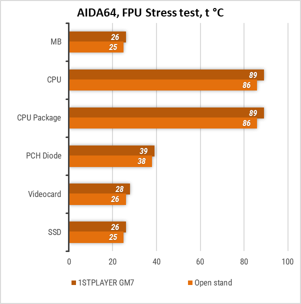 У стрес-тесті AIDA 64 Stress FPU різниця між температурою процесора всередині корпуса та на відкритому стенді становила всього 3°C. Інші компоненти демонстрували ще менші коливання – лише 1–2 °C, що свідчить про ефективну циркуляцію повітря всередині 1STPLAYER GM7.