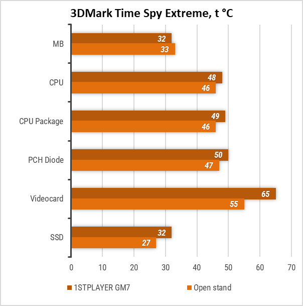 У бенчмарку 3DMark Time Spy Extreme різниця температур була більш помітною: процесор нагрівся всього на 3 °C більше, ніж на відкритому стенді, а відеокарта прогрілася до 65 °C проти 55 °C на стенді.