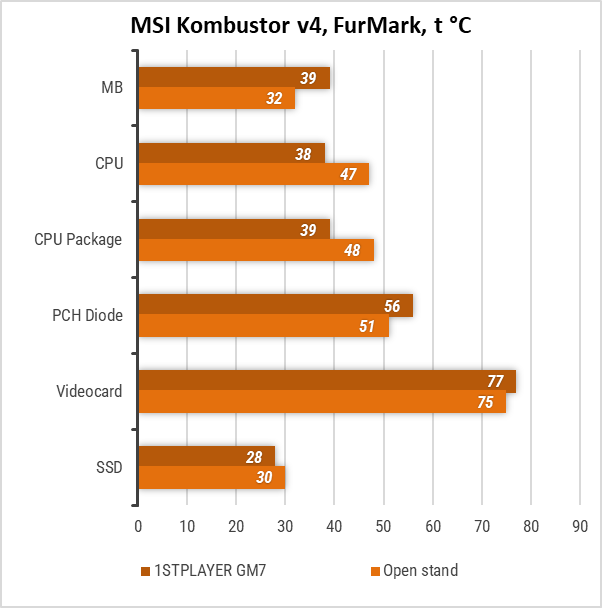 Під час навантаження тестом FurMark у MSI Kombustor v4 відеокарта всередині корпуса нагрілася на 2 °C більше, ніж на відкритому стенді. Температура процесора залишалася в межах комфортних значень у обох випадках.