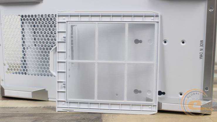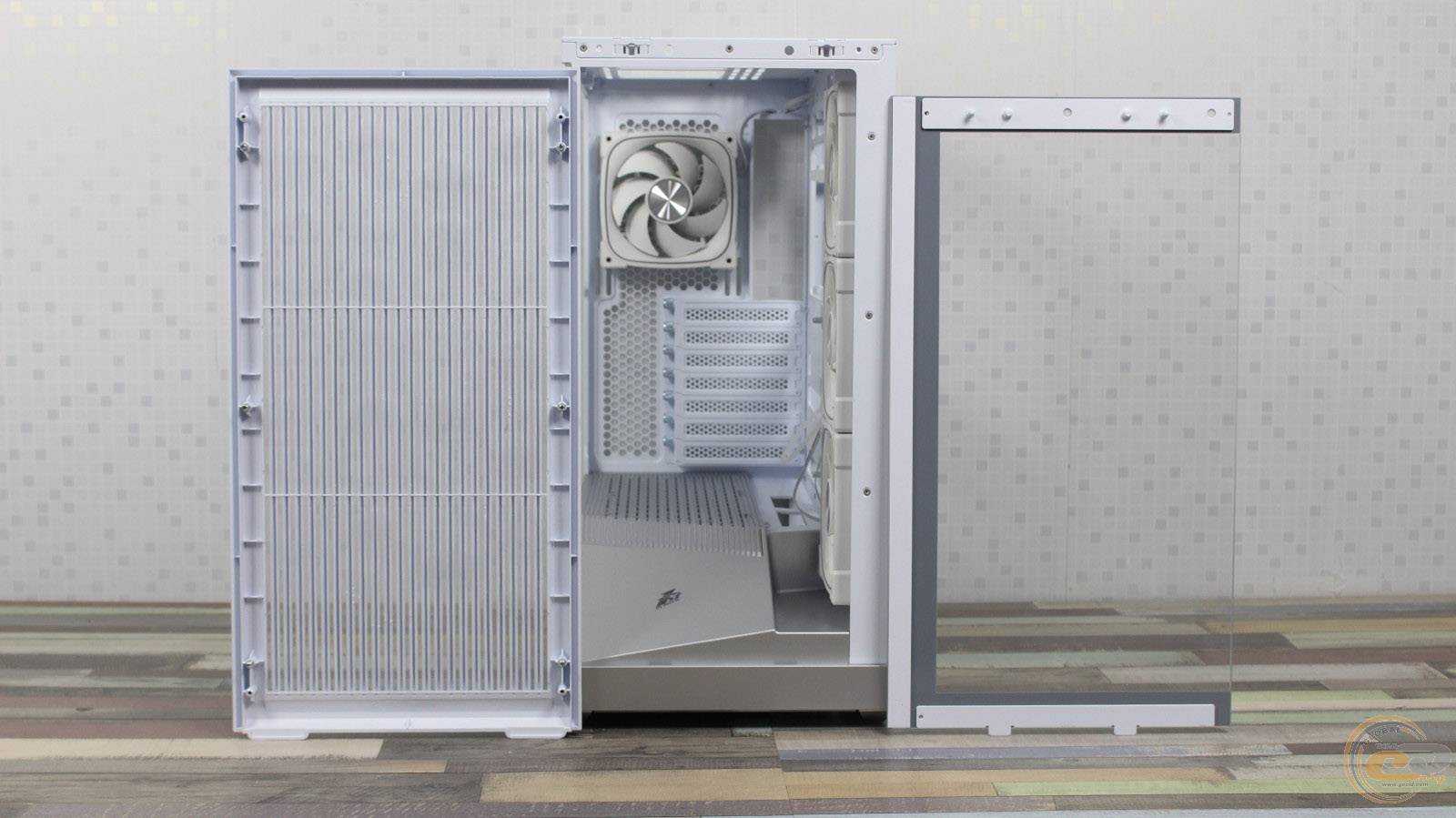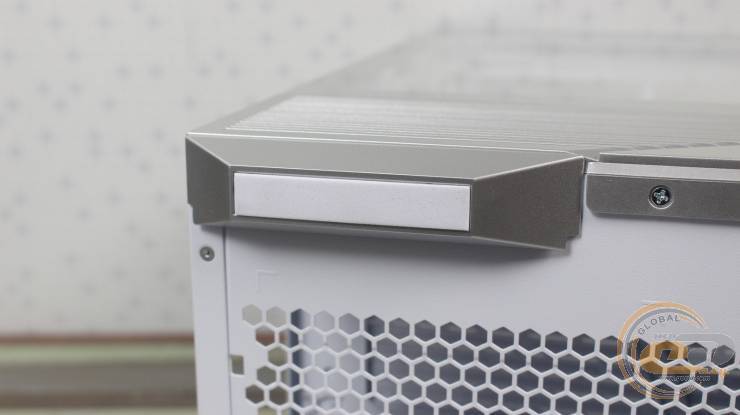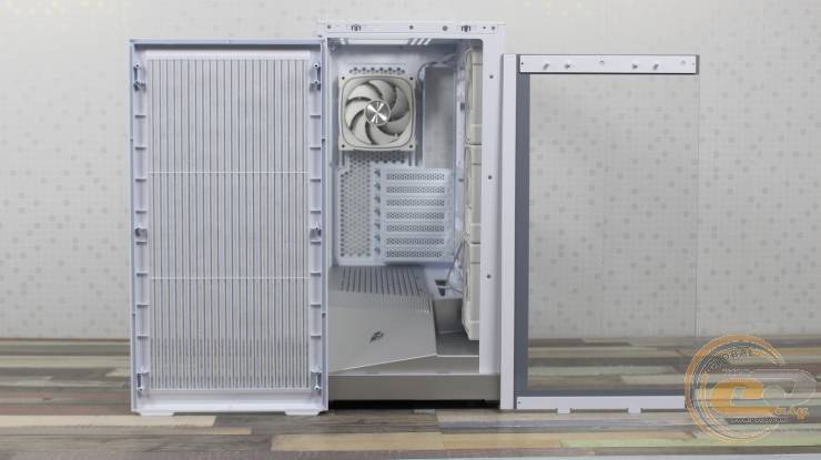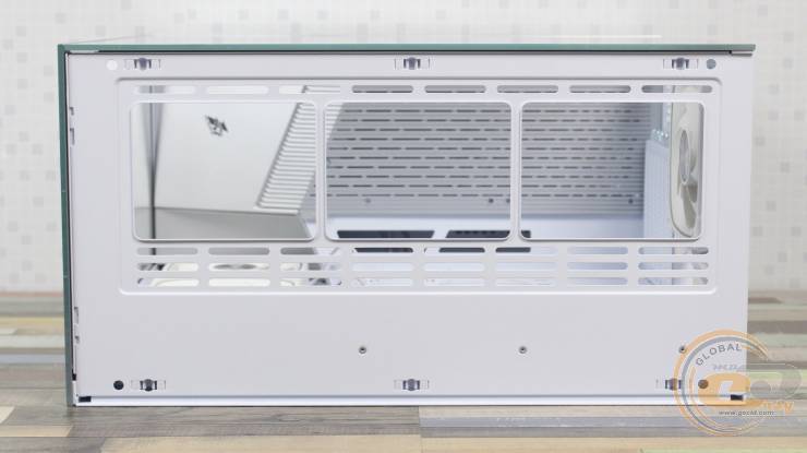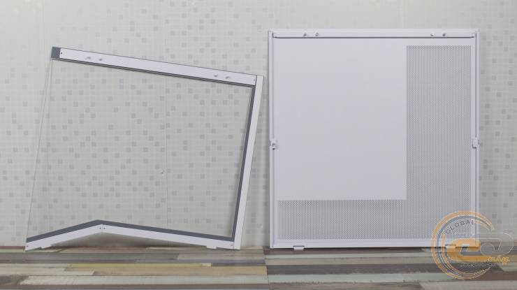 Загартоване скло спереду легко знімається: його фіксують два пластикові затискачі та «грибочки», а також невеликий пластиковий елемент висотою 20 мм у нижній частині. Така конструкція значно спрощує демонтаж і дозволяє легко розміщувати комплектуючі всередині корпуса.