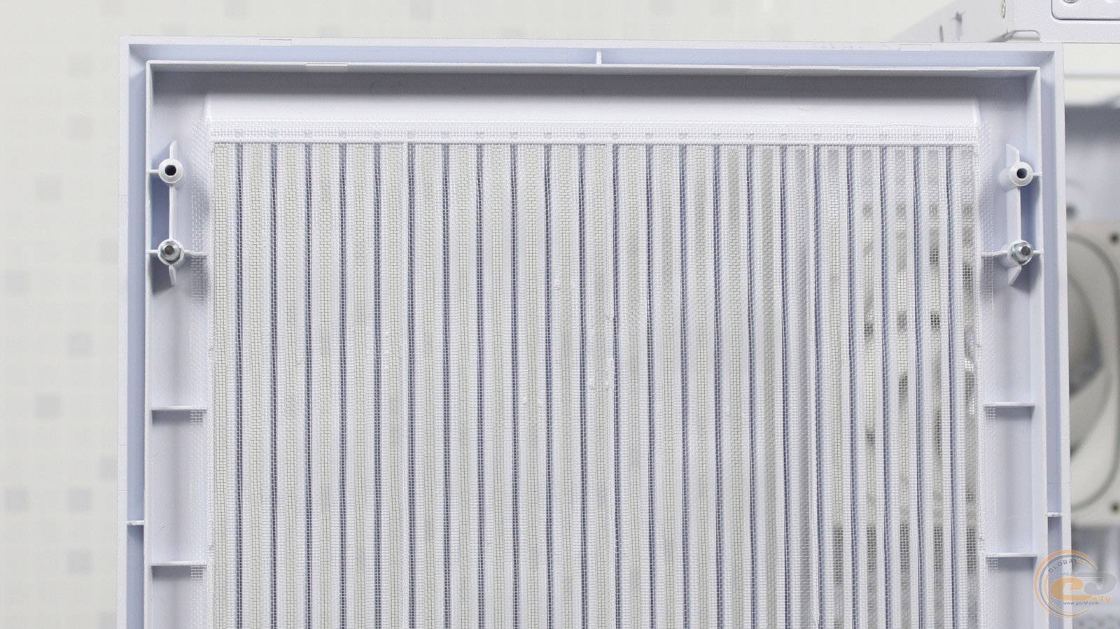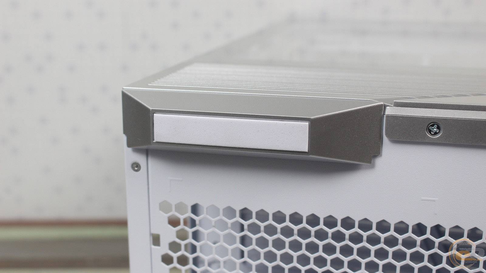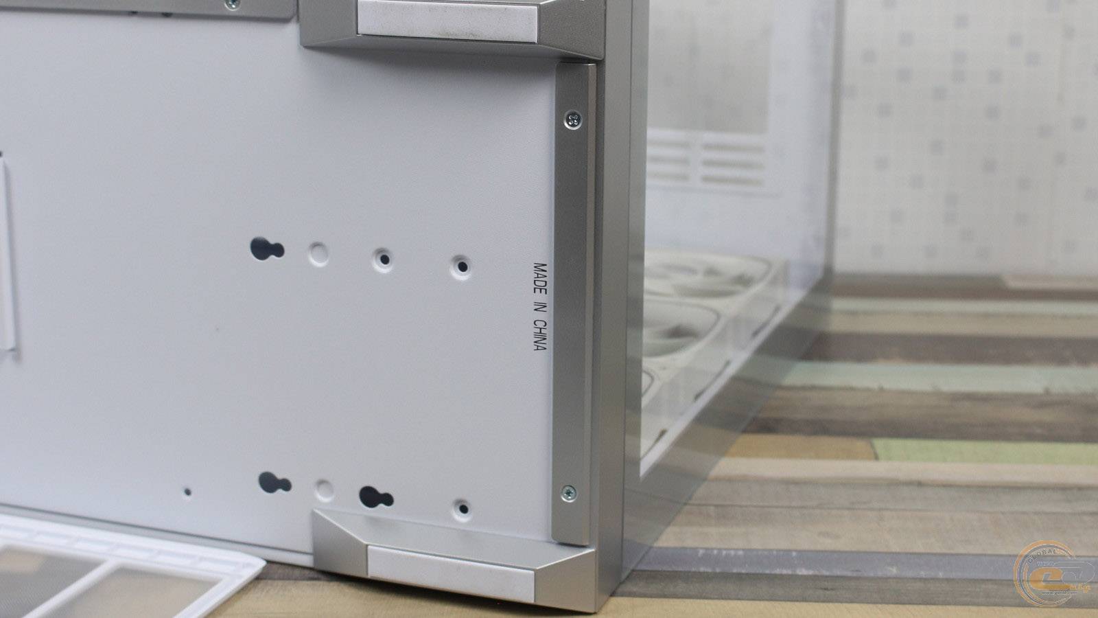 Загартоване скло спереду легко знімається: його фіксують два пластикові затискачі та «грибочки», а також невеликий пластиковий елемент висотою 20 мм у нижній частині. Така конструкція значно спрощує демонтаж і дозволяє легко розміщувати комплектуючі всередині корпуса.
