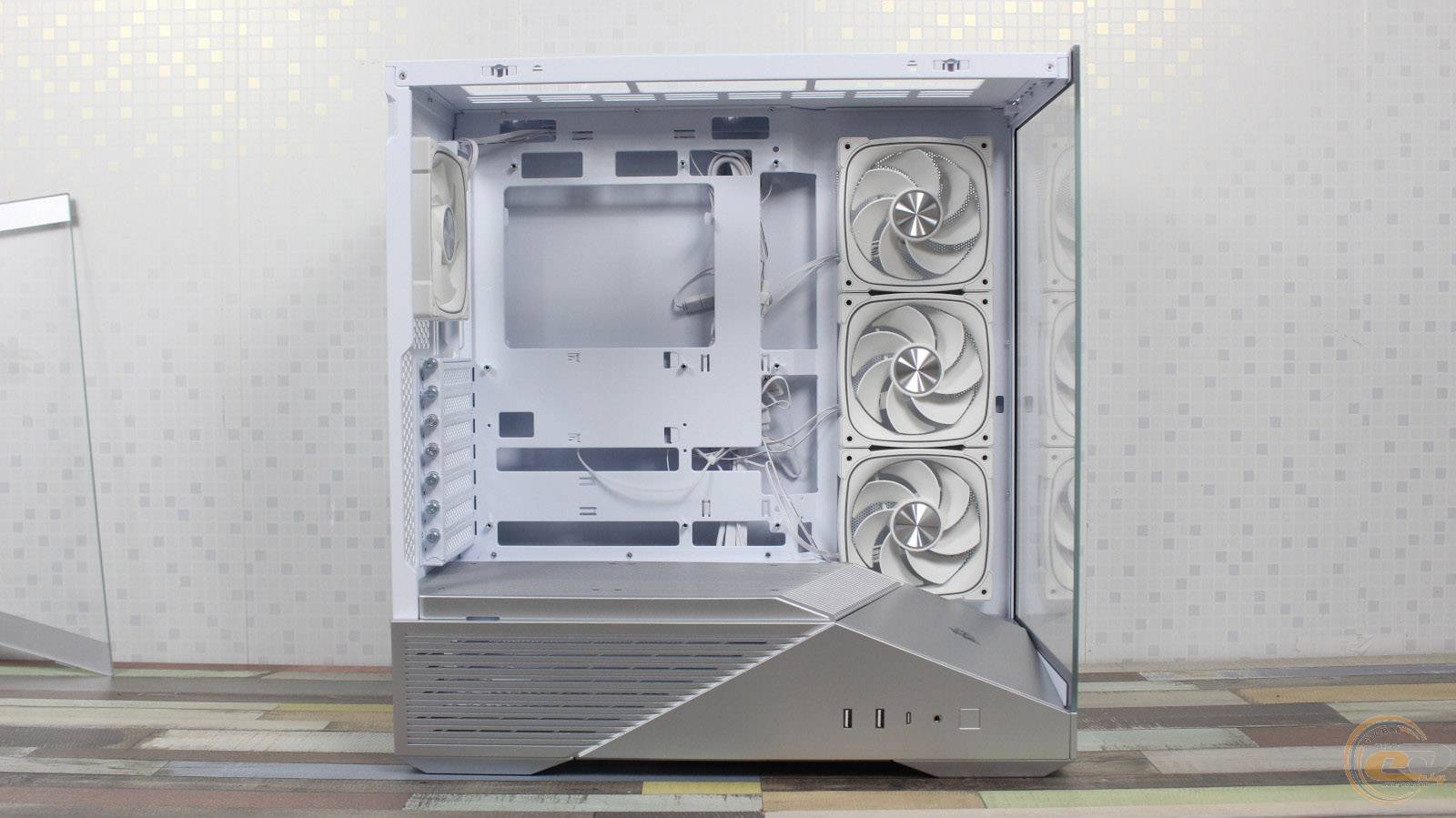 Передній край лівої скляної панелі повністю прозорий. Загальні габарити цієї панелі трохи менші за праву через розташування портів під нею, що варто враховувати при складанні системи.