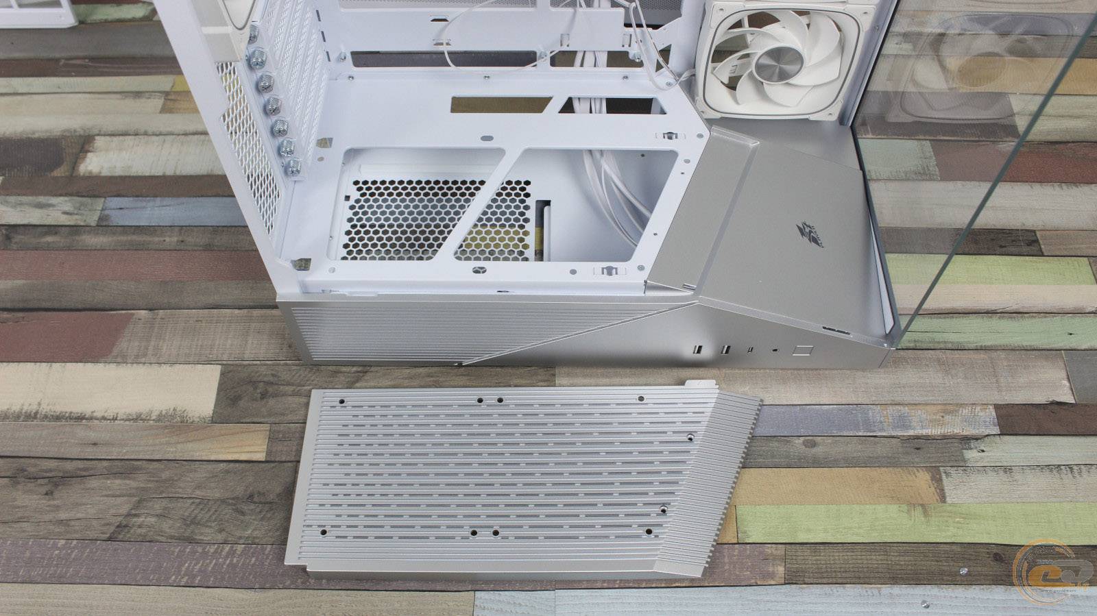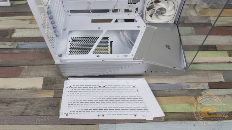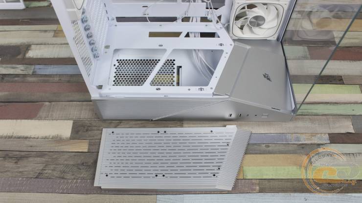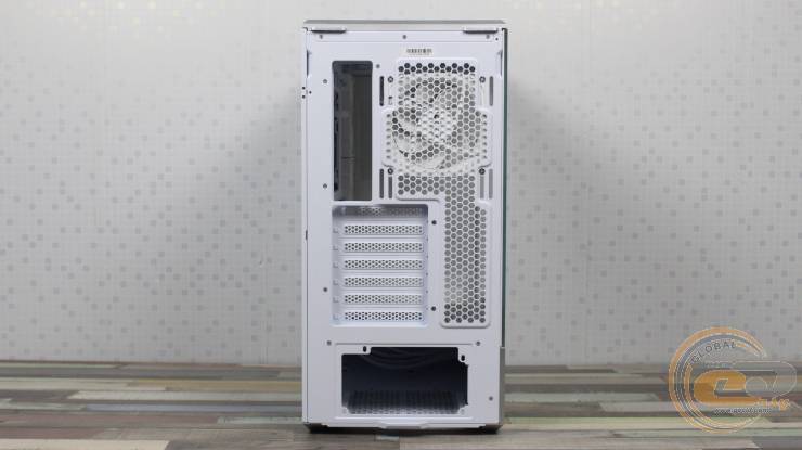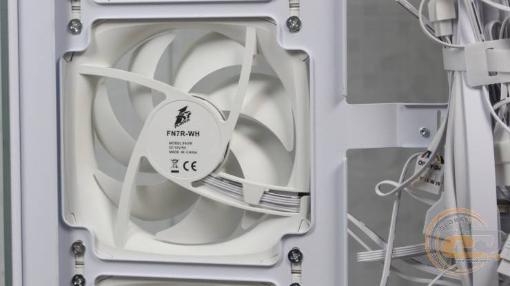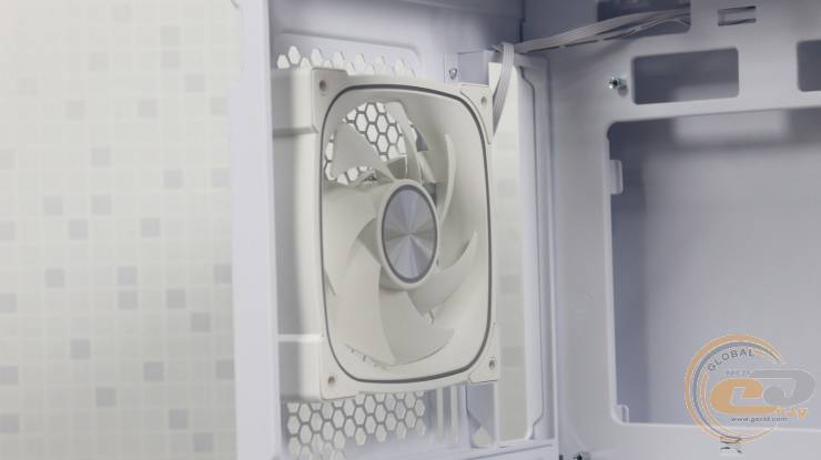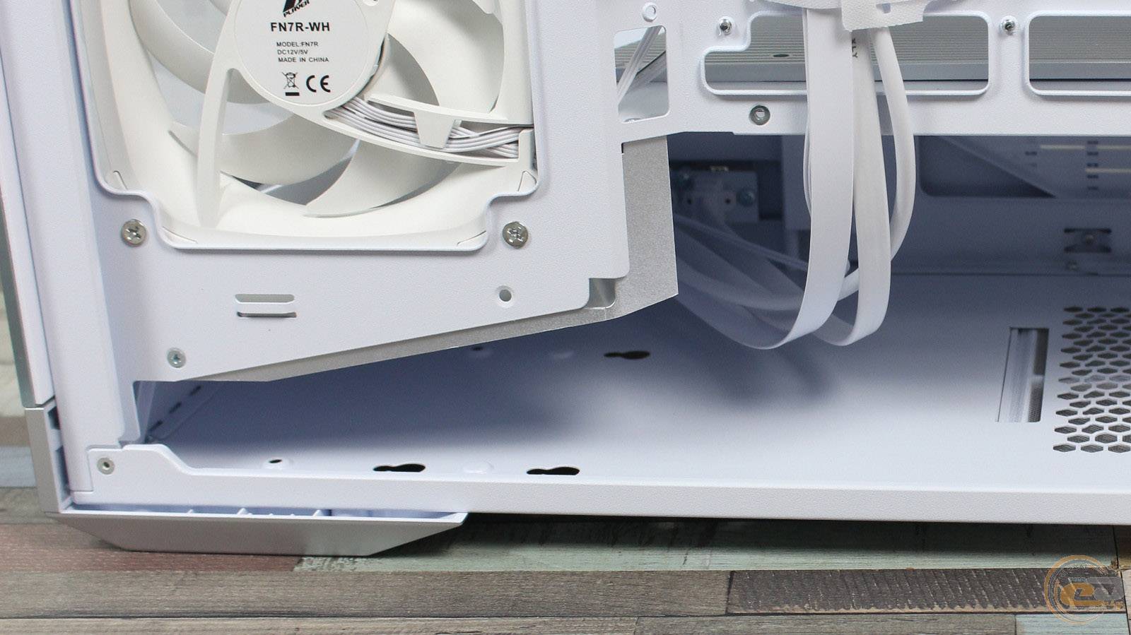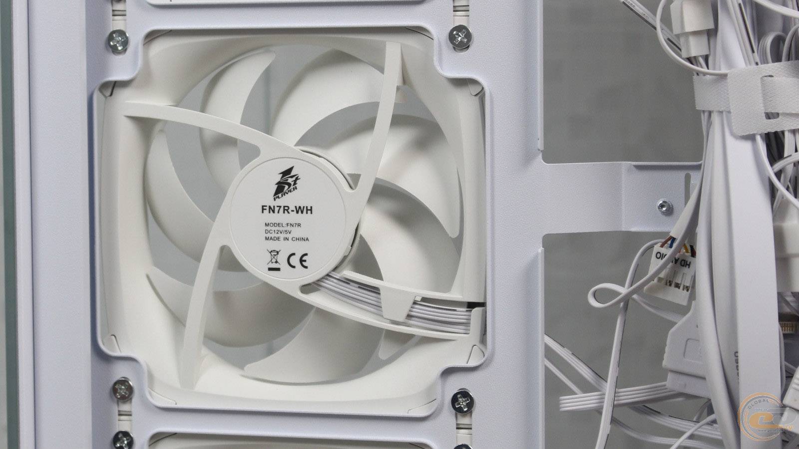 На ній праворуч знаходиться посадкове місце для одного 120-мм вентилятора, де виробником встановлений 120-мм семилопатевий вентилятор 1STPLAYER FN7-WH із підтримкою ШІМ-регулювання швидкості обертання у діапазоні 600 – 1800 ± 10% об/хв. Його рівень шуму може досягати 28,95 дБ(А), а максимальний повітряний потік знаходиться на позначці у 39,4 CFM (66,94 м3/год).