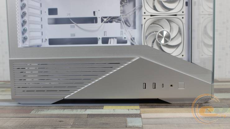 На нижньому краю лівої боковини розташовані два порти USB 3.0 та один USB 3.2 Gen 2 Type-C. Кнопка запуску ПК позбавлена індикатора, що виглядає трохи дивно.