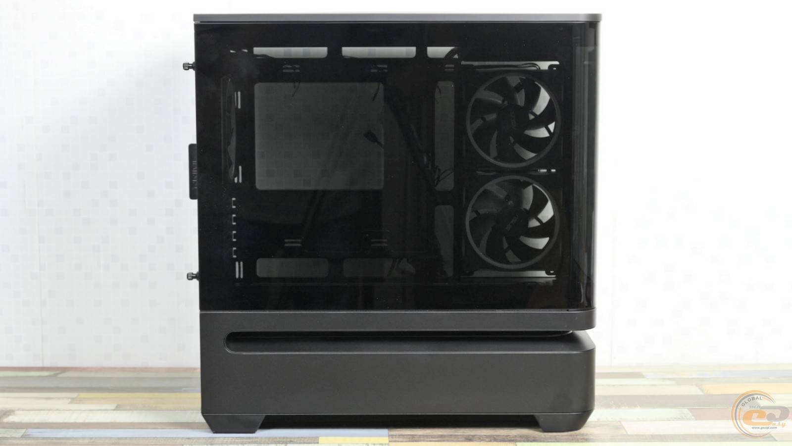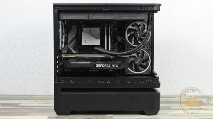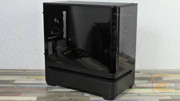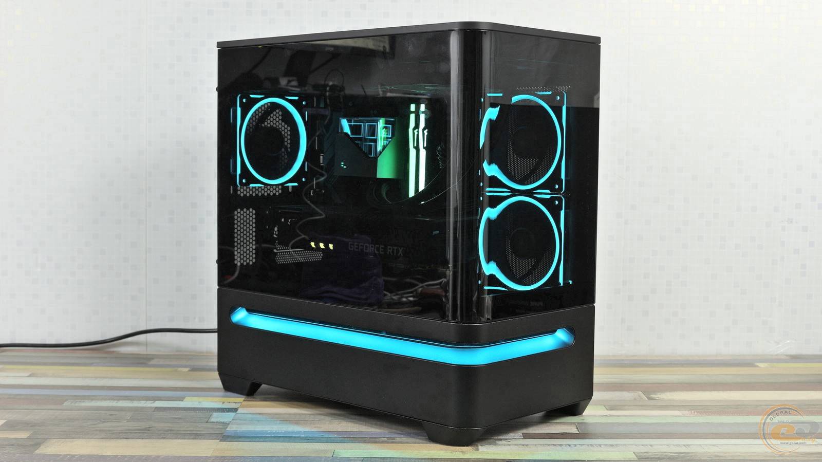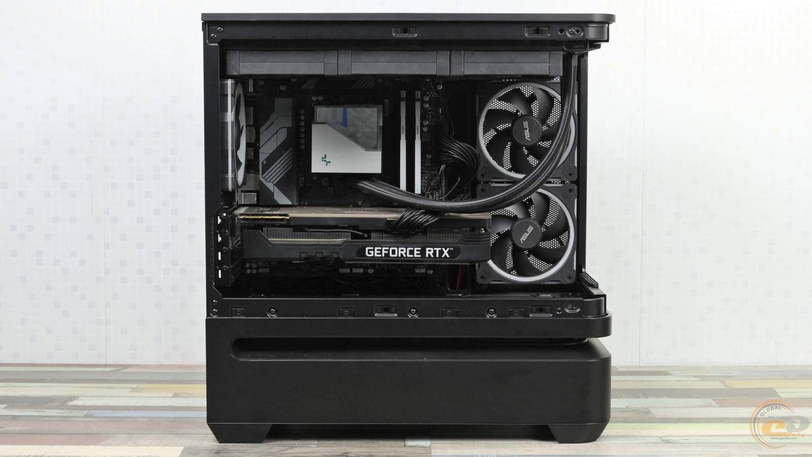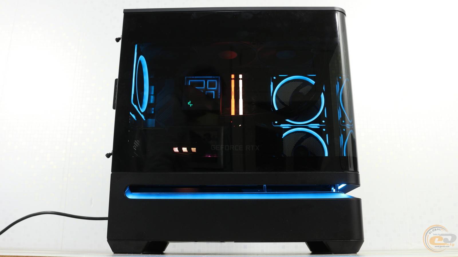 Насамперед варто відзначити нішу в нижній частині, яка не лише прикрашена LED-стрічкою, а й ефективно постачає прохолодне повітря до відеокарти. Практичні тести підтвердили результативність цього рішення: навіть потужна GeForce RTX 3090 із TDP 350 Вт працювала в корпусі дуже комфортно.