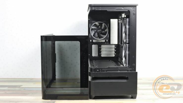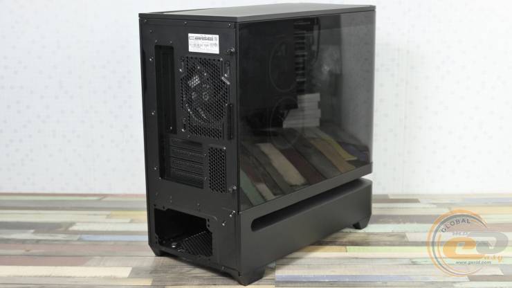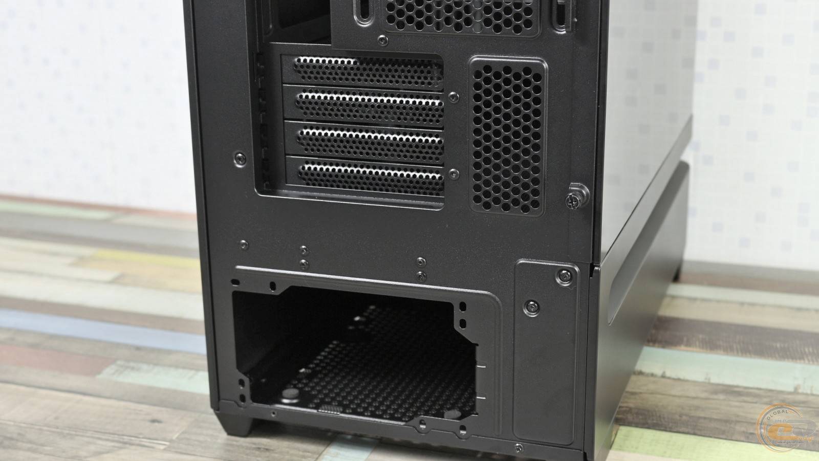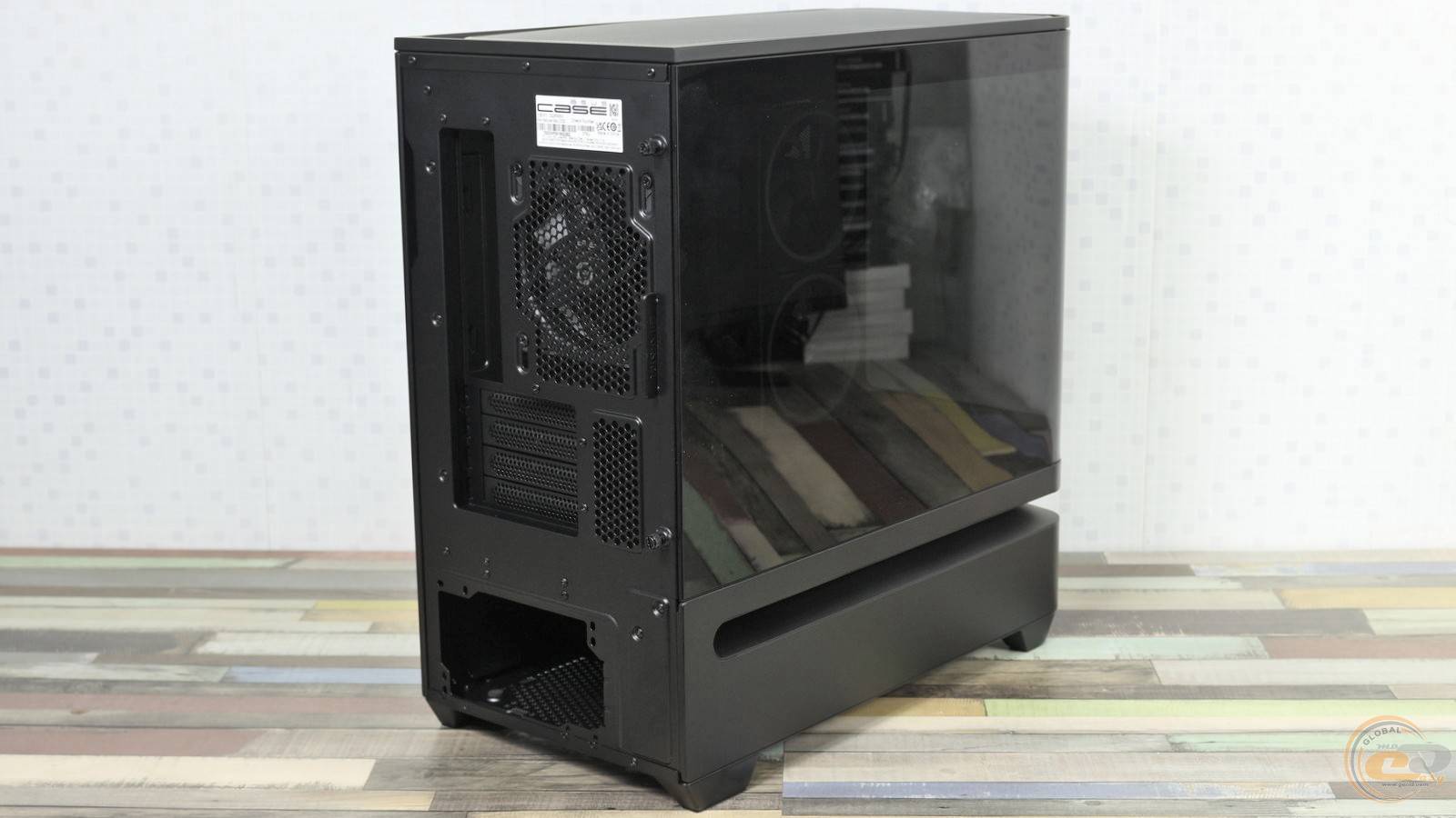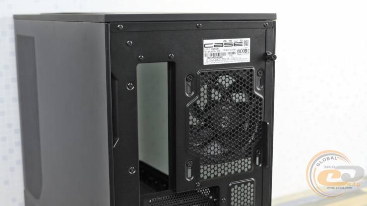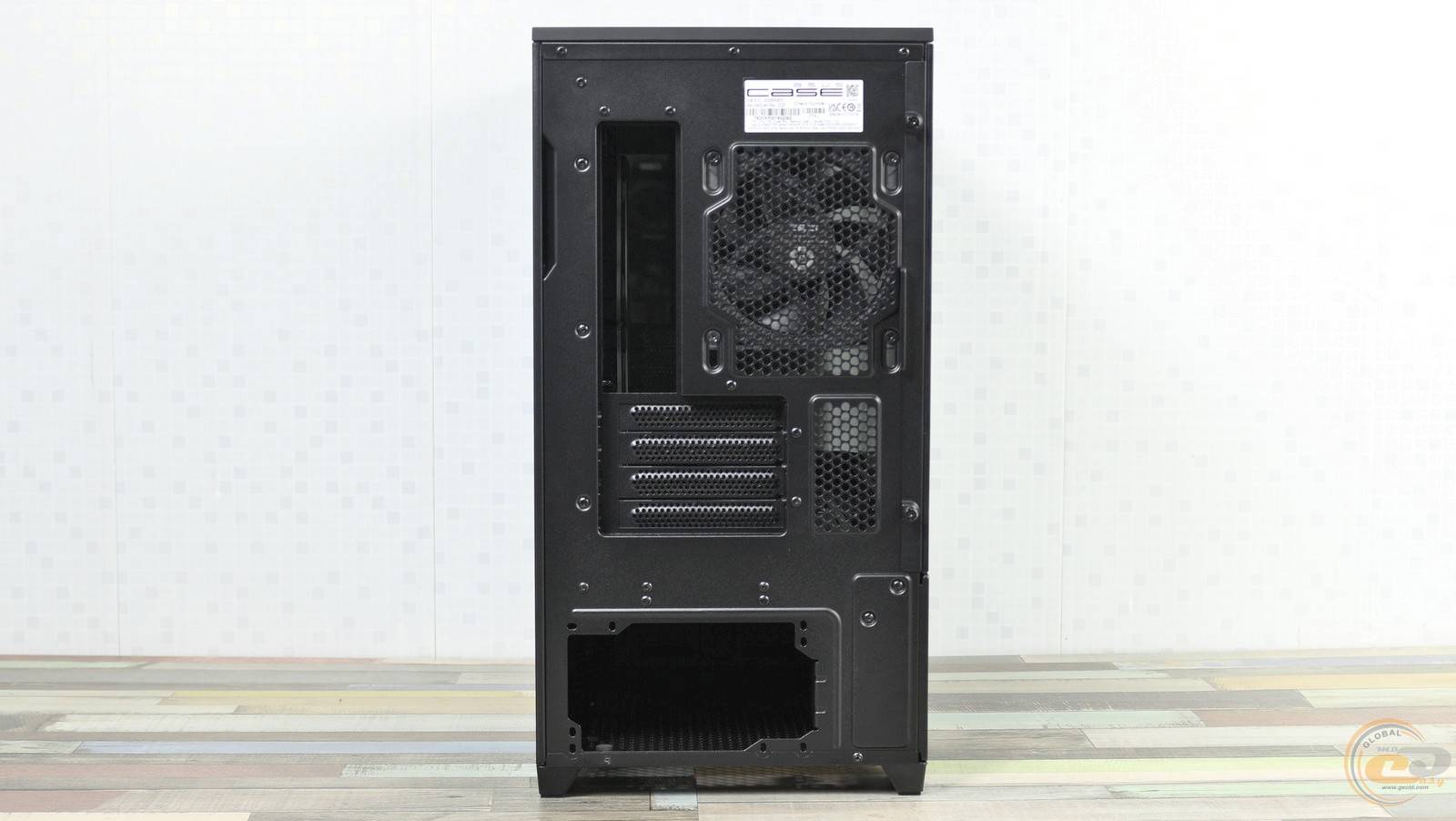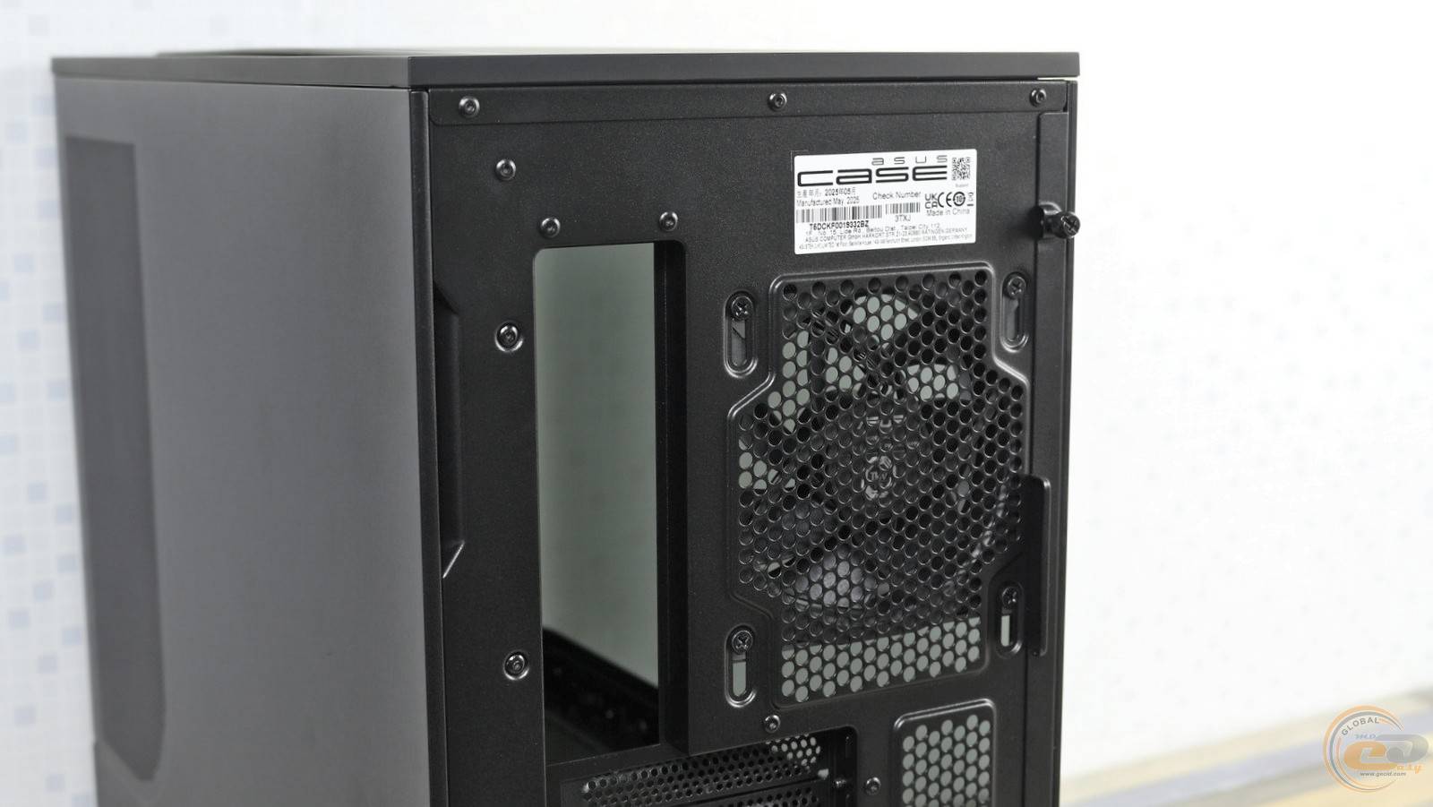 Версія корпуса з приставкою «ARGB» відрізняється наявністю трьох попередньо встановлених 120-мм вентиляторів з підсвіткою. Один із них примостився позаду, а отвори-пази дозволяють регулювати висоту його розташування. Поряд видно один із двох гвинтів кріплення скляної боковини, тоді як металева панель фіксується безгвинтовим способом.