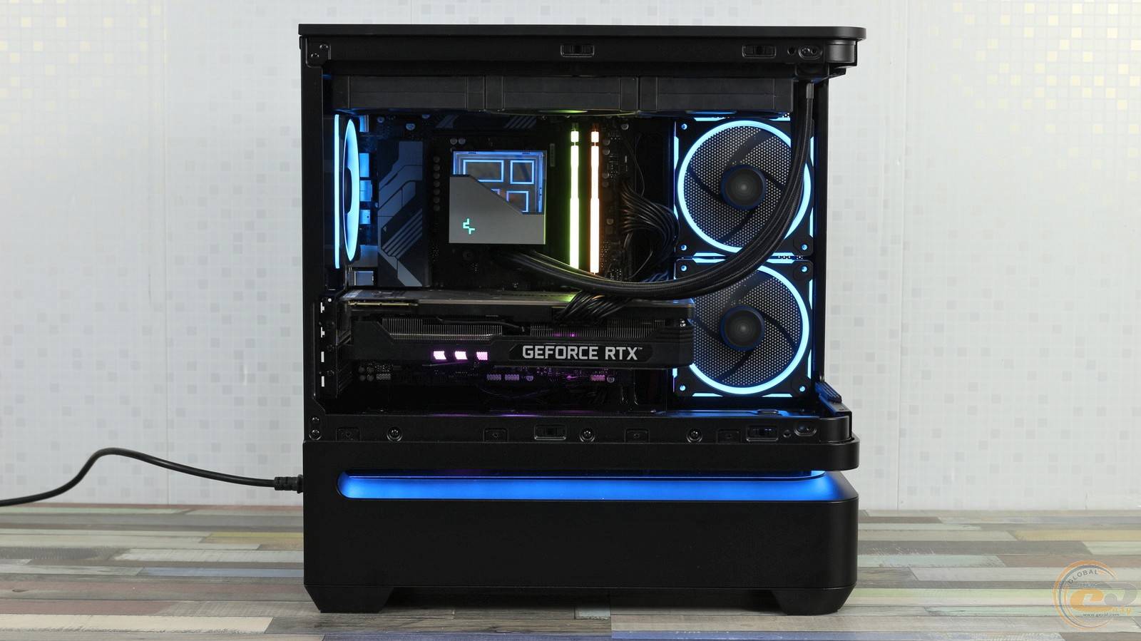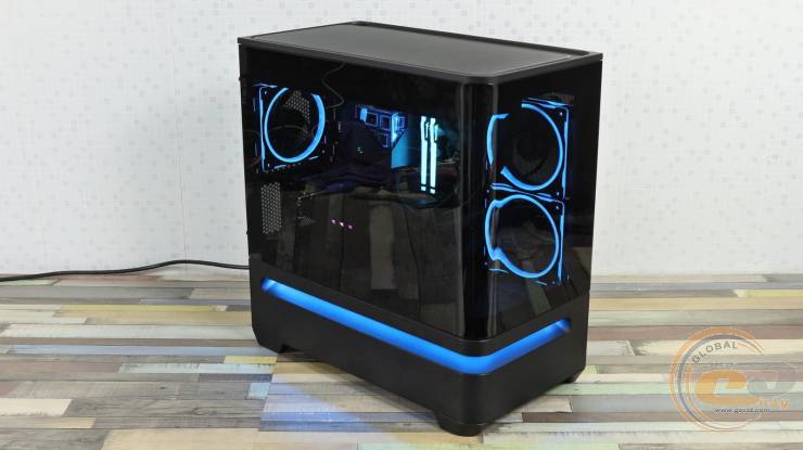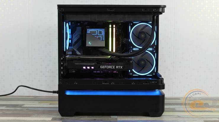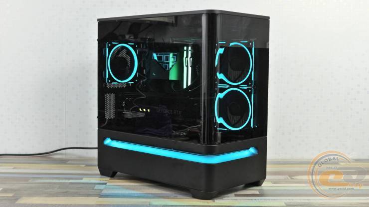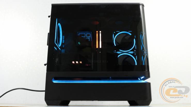 З подачею живлення стає зрозумілим ще одне призначення ніші у нижній частині — в ній розташована світлодіодна стрічка, яка світиться синхронно з комплектними вентиляторами.