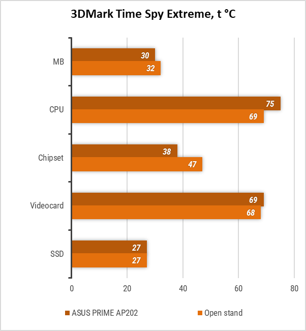У тесті 3DMark Time Spy процесор у корпусі виявився гарячішим на цілих 7°C, тоді як відеокарта — лише на 1°C. Цікаво, що чипсету в цьому та двох інших бенчмарках було навіть «комфортніше» всередині системника, ніж на відкритому стенді.