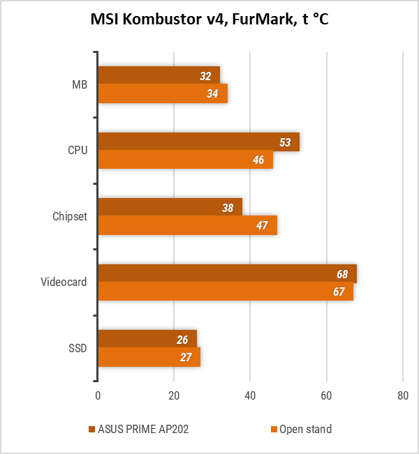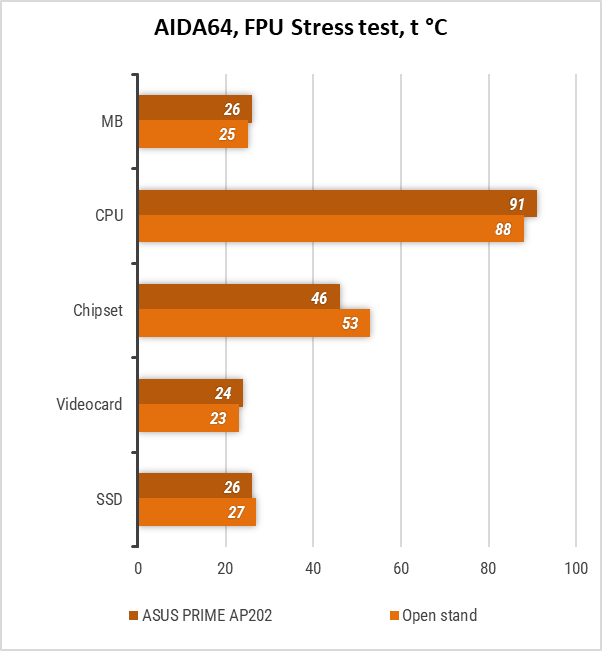 Тож наявність вирізу-ніші для захоплення повітря у нижній частині ASUS Prime AP202 ARGB допомогла отримати дуже хороші показники нагрівання відеокарти. І це при тому, що TDP використовуваного прискорювача становить близько 350 Вт. В свою чергу відведення тепла від 170-ватного процесора було уже не настільки успішним. Можливо, ситуацію змінило б використання реверсивних пропелерів на боковині. Тож даний факт варто брати до уваги при виборі «камінця» та кулера для нього.