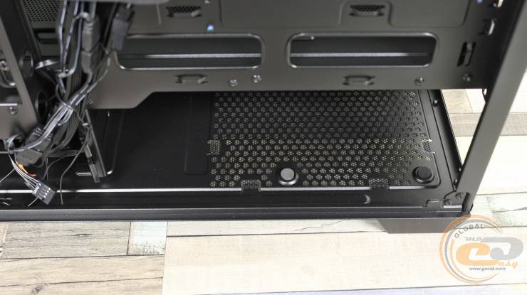 Сприятиме ефективній вентиляції й чимала висота ніжок корпуса — 22 мм. Тут також розташований знімний пиловий фільтр, який допоможе підтримувати чистоту всередині системника.