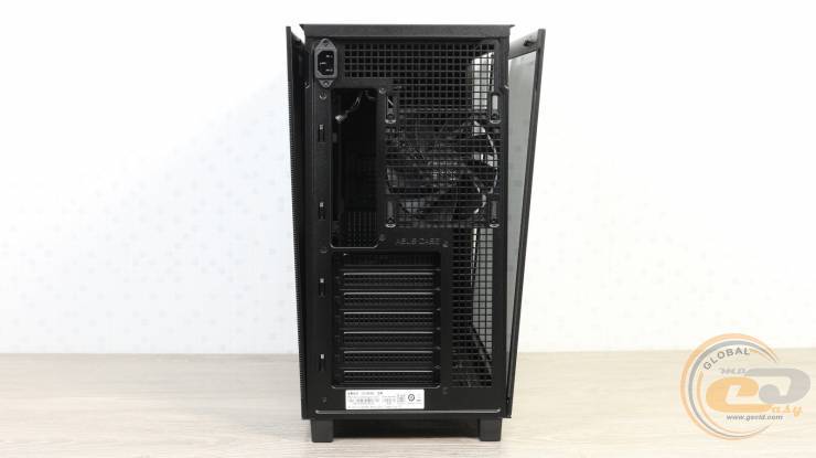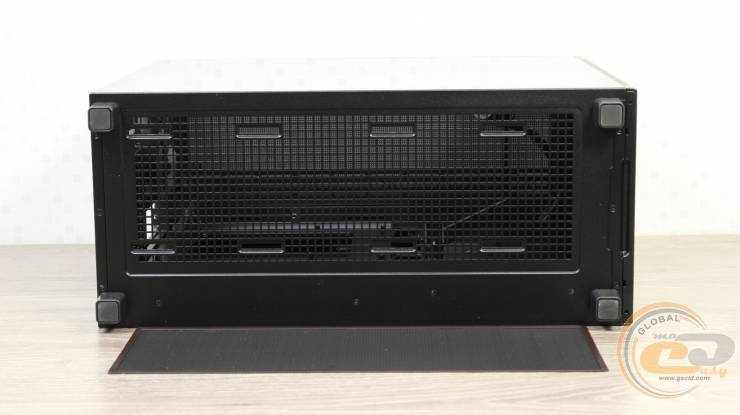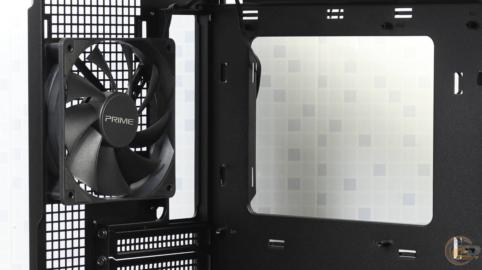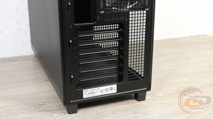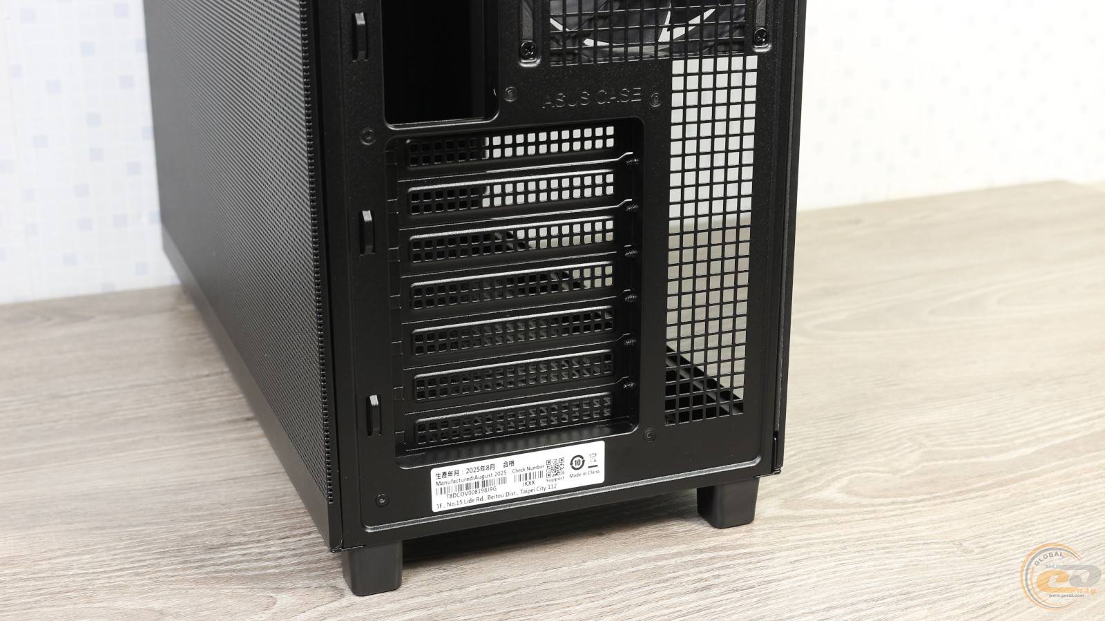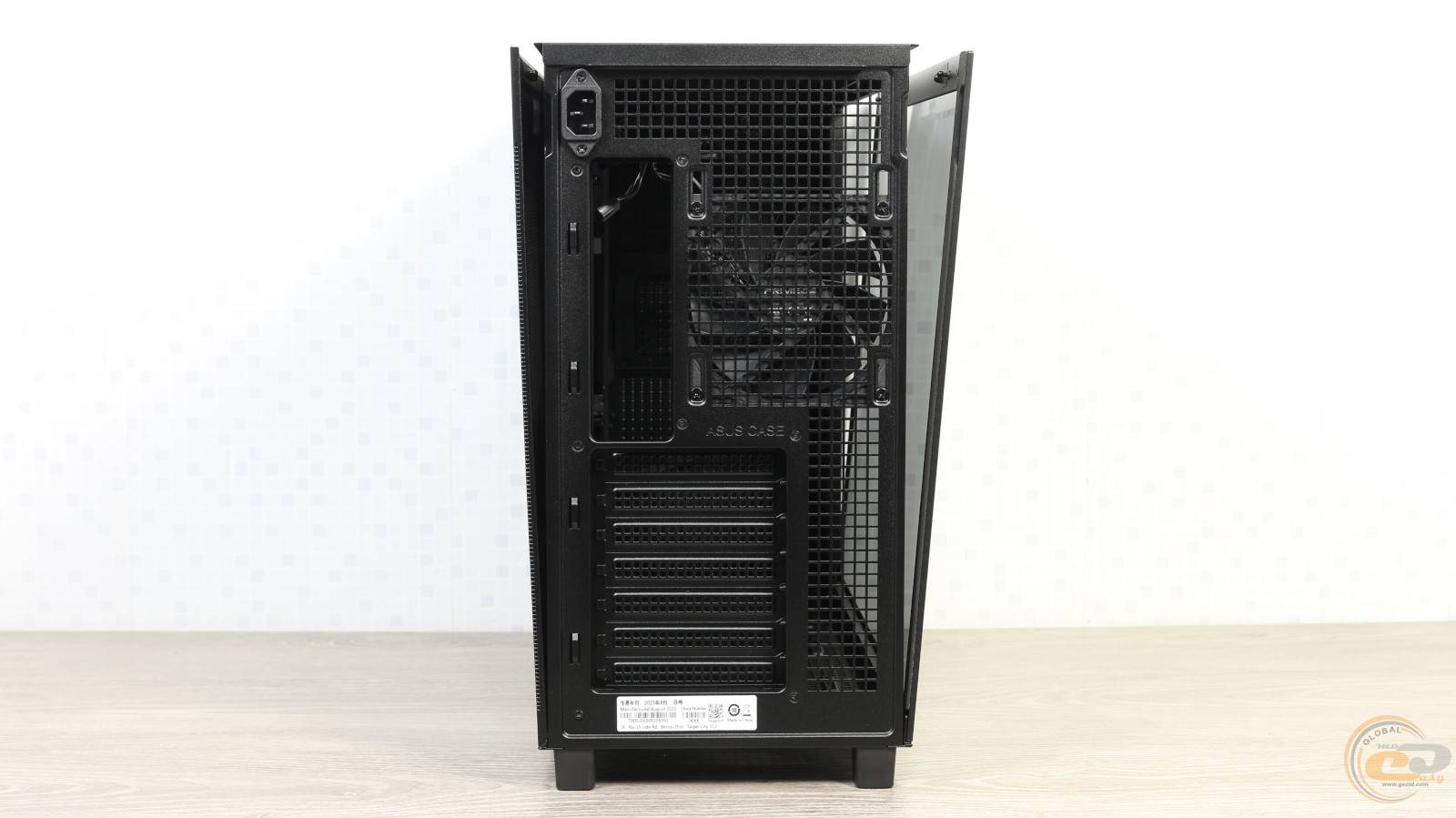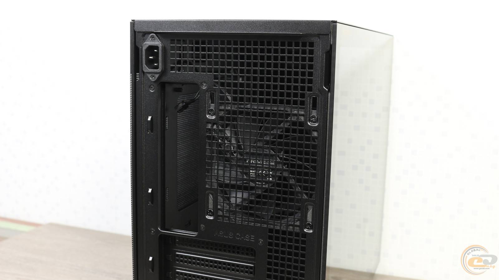 На тильній стороні корпуса замість отвору для блока живлення є лише роз’єм для підключення силового кабелю. Сама боковина є щедро перфорованою та має посадкове місце для одного 120-мм вентилятора, де виробником завчасно встановлена 120-мм дев’ятилопатева вертушка ASUS TC12025MH із підтримкою ШІМ-регулювання швидкості обертання до 1500 об/хв. Шум від її роботи на максимумі можна охарактеризувати як середній, але комфортний.