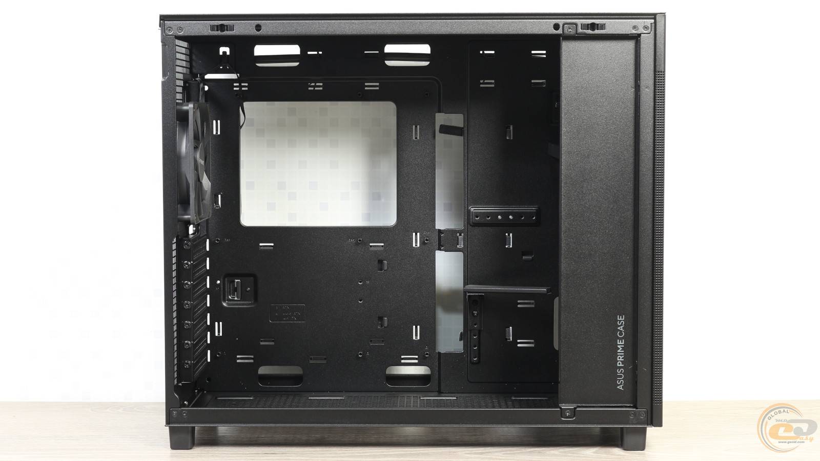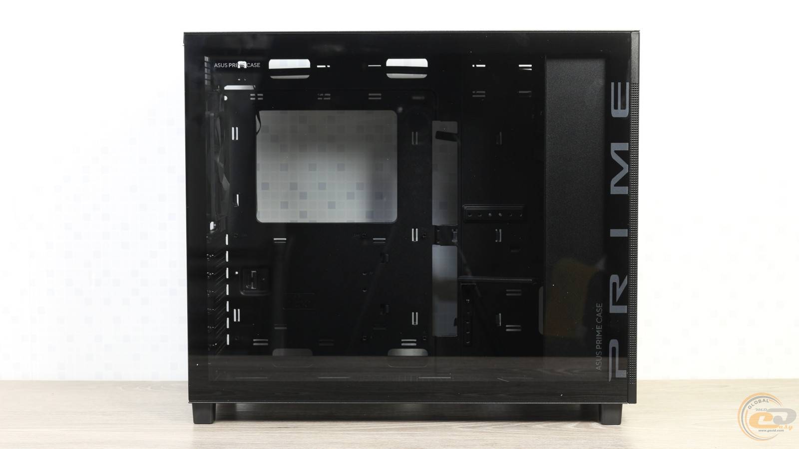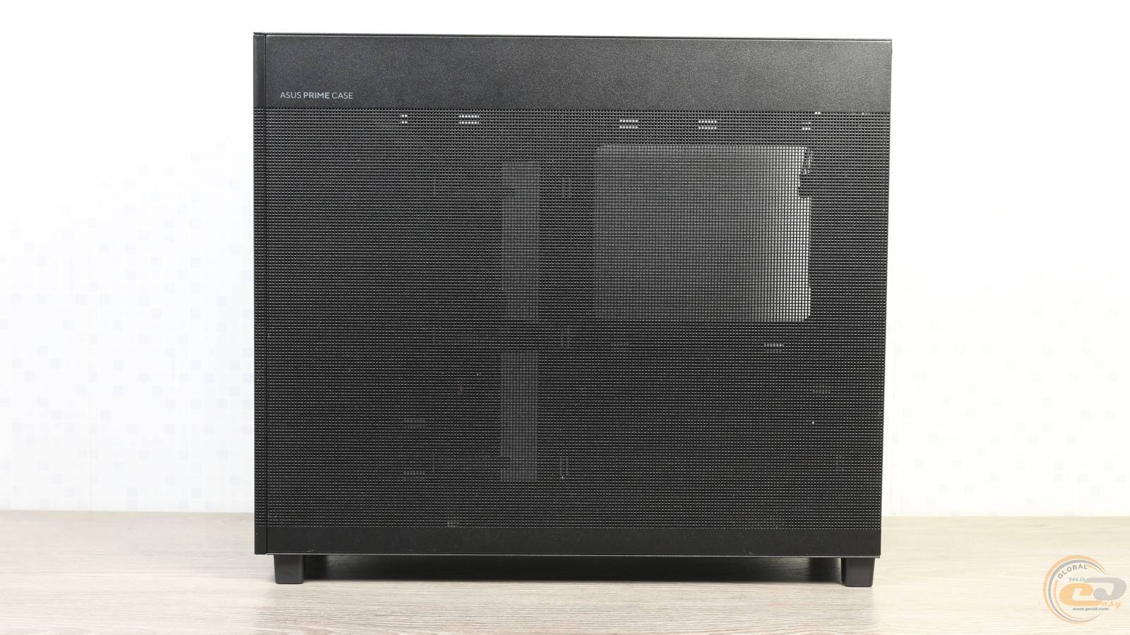 Права бічна панель виконана зі сталі товщиною 0,86 мм та майже повністю перфорована. На її зовнішній стороні ближче до верхнього кута присутній невеликий напис «ASUS PRIME CASE». На жаль, виробник і тут вирішив обійтися без використання пилового фільтра.