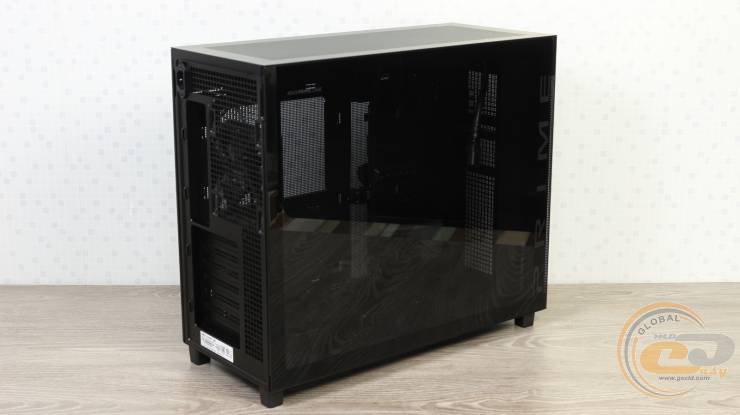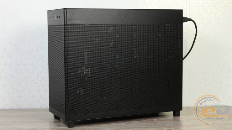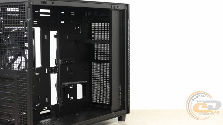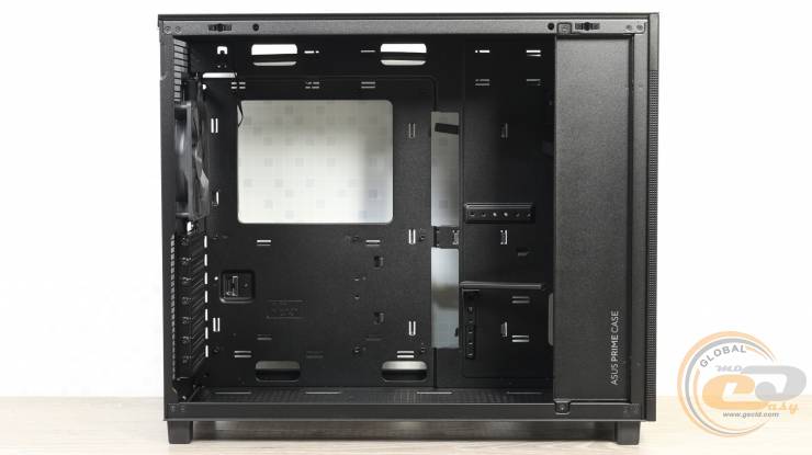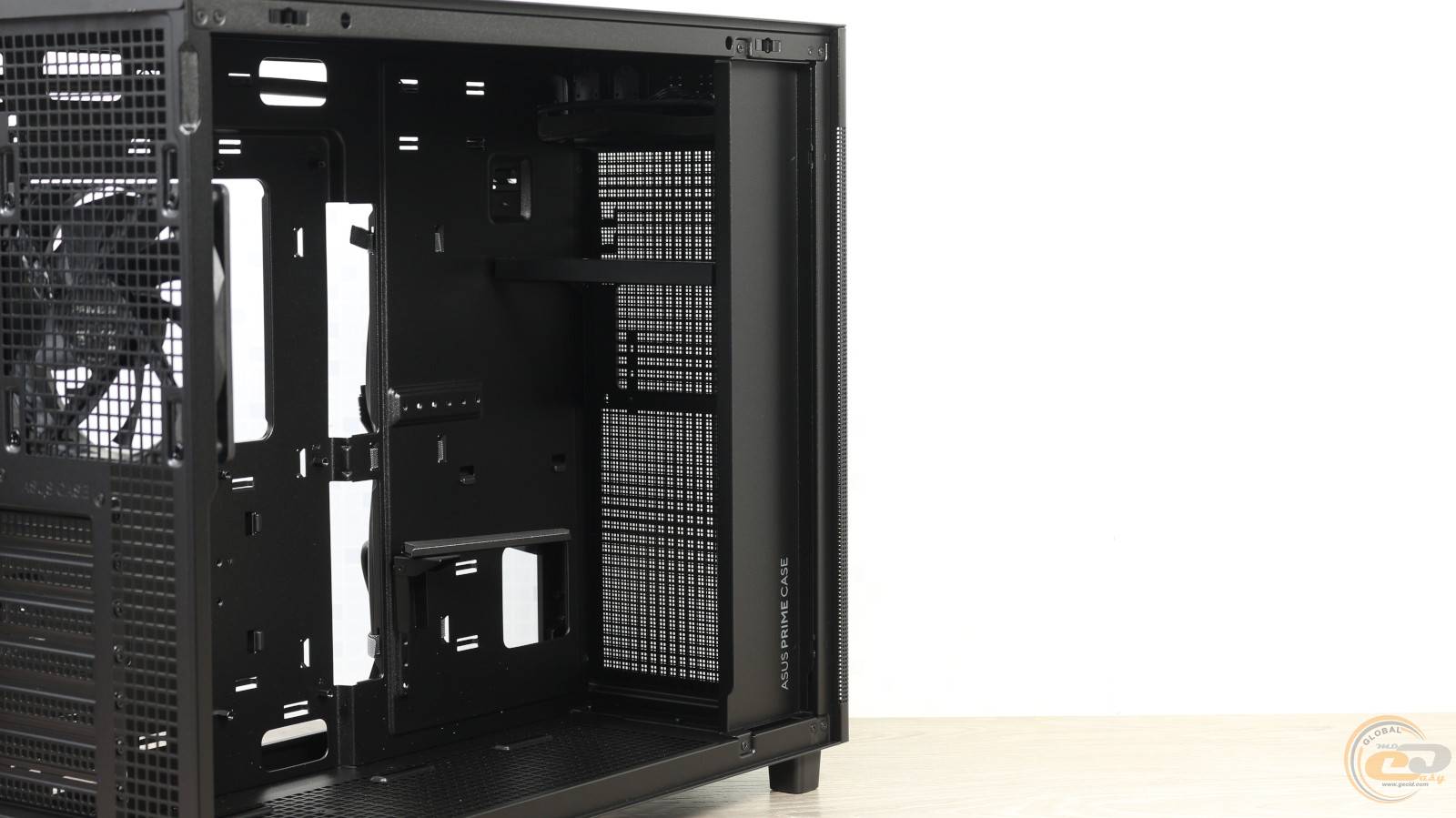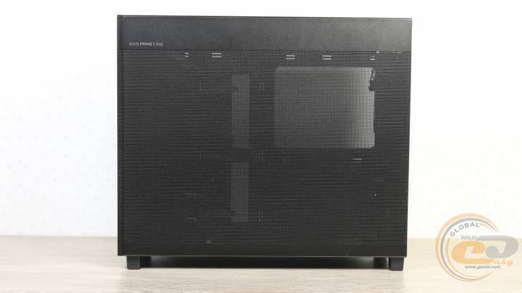Права бічна панель виконана зі сталі товщиною 0,86 мм та майже повністю перфорована. На її зовнішній стороні ближче до верхнього кута присутній невеликий напис «ASUS PRIME CASE». На жаль, виробник і тут вирішив обійтися без використання пилового фільтра.