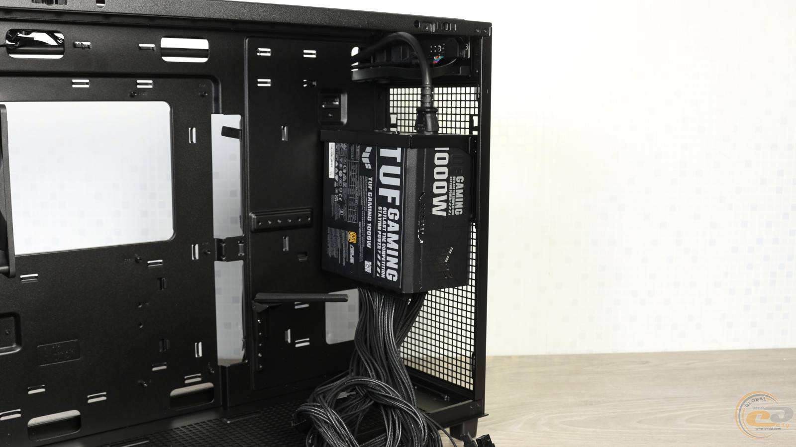 Сам кошик блоку живлення тримається на двох зачепах зверху та двох гвинтах знизу (їх можна викрутити зі сторони фронтальної панелі). БЖ у кошику можна орієнтувати як вентилятором назовні (для забору повітря), так і всередину корпуса (щоб брати повітря зсередини).