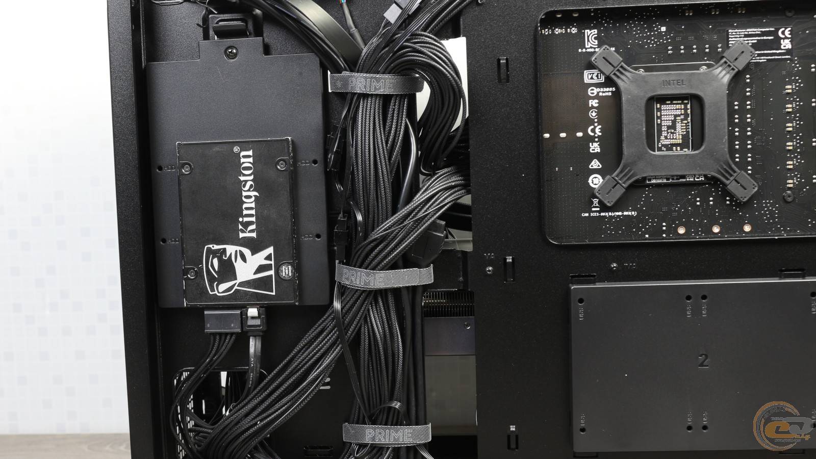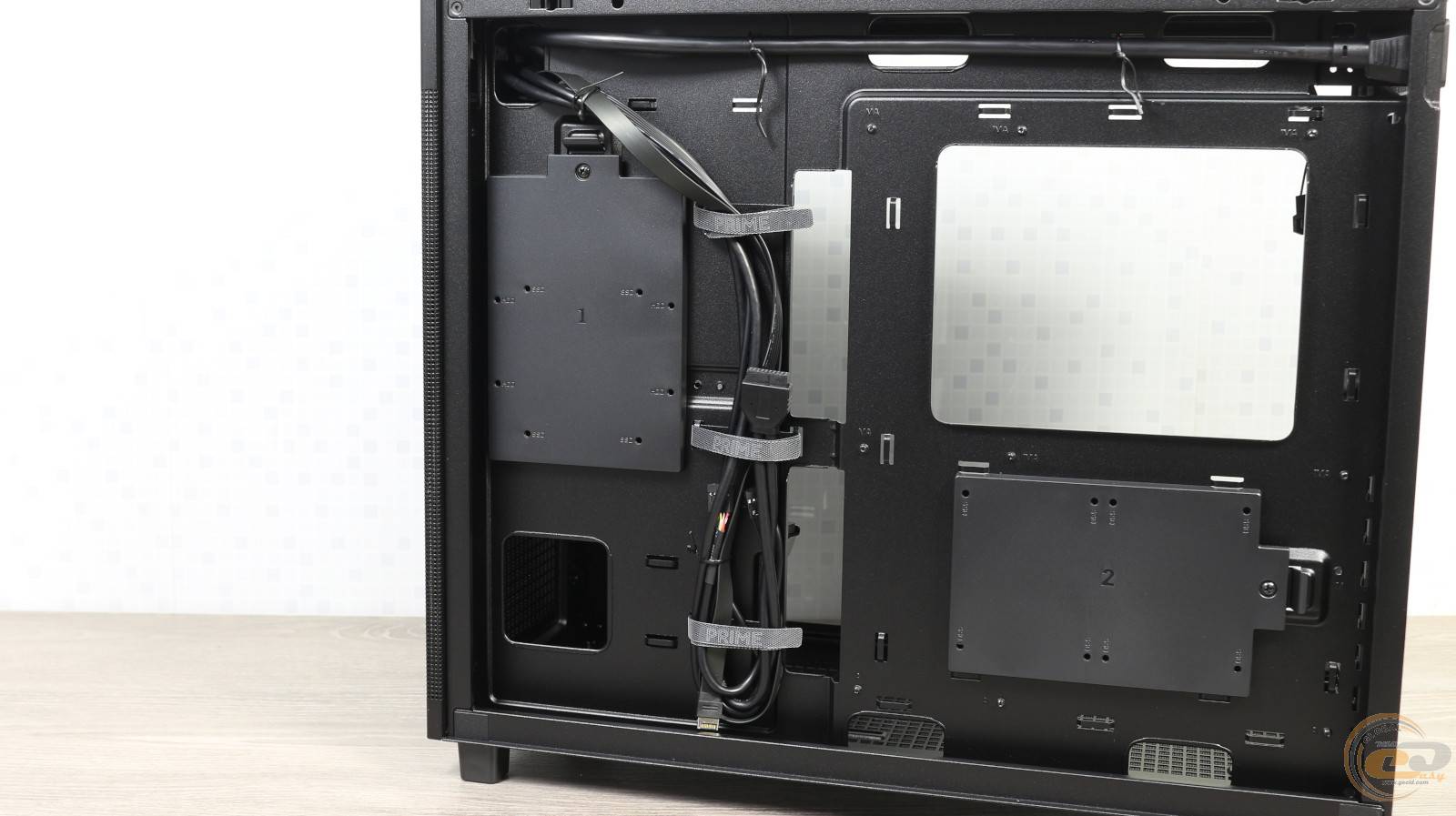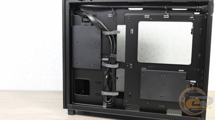 Також за піддоном материнської плати наявний запас простору для прихованого вкладання кабелів, що варіюється від 10 (ближче до тильної стінки) до 34 мм (передня частина корпуса). Гарно усе згрупувати допоможуть одноразові стяжки, що входять до комплекту постачання, та три завбачливо встановлені виробником стяжки-липучки. Єдине, що потрібно враховувати, — часткову видимість кабелів через сітчасту бічну панель.
