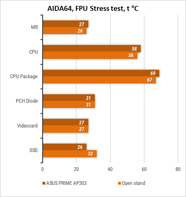 У стрес-тесті AIDA 64 Stress FPU процесор не прогрівся навіть до 70°C. Отримана різниця між його температурою всередині корпуса та на відкритому стенді склала мізерні 2°C. За рахунок перфорації більшої частини панелей корпуса усі інші компоненти (за винятком відчутно охололого SSD) майже не відчули різниці між вищезгаданими варіантами.