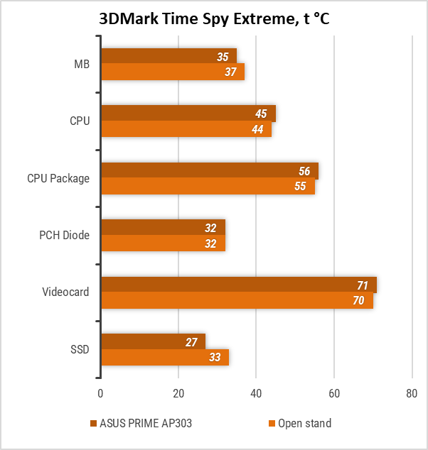 При проходженні бенчмарку 3DMark Time Spy Extreme кардинально становище не змінилось, а температури процесора та відеокарти в корпусі виявились вищими лише на 1 °C порівняно з відкритим стендом.
