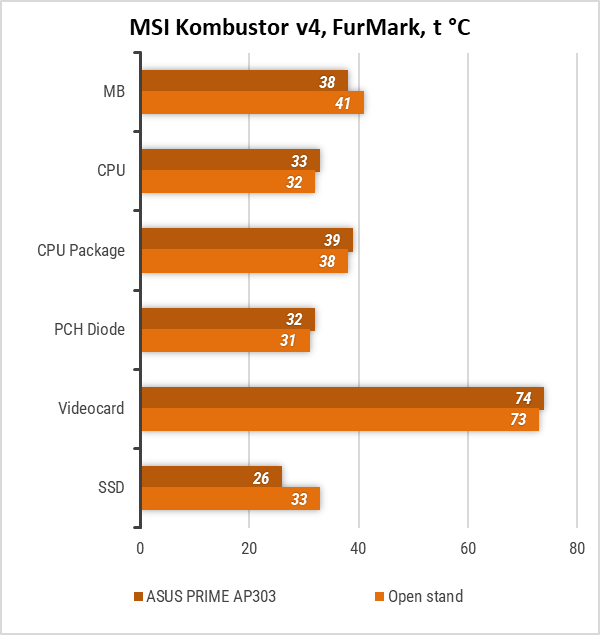 У питанні показовості результатів залишалася надія лише на тест FurMark у MSI Kombustor v4. Проте він також продублював раніше зафіксовану різницю у 1°С. Тобто температура відеоадаптера на відкритому стенді становила 73°С, а всередині героя нашого огляду - 74°С. Приємно було також бачити, що температурні показники процесора між собою відрізнялися лише на 1°С.