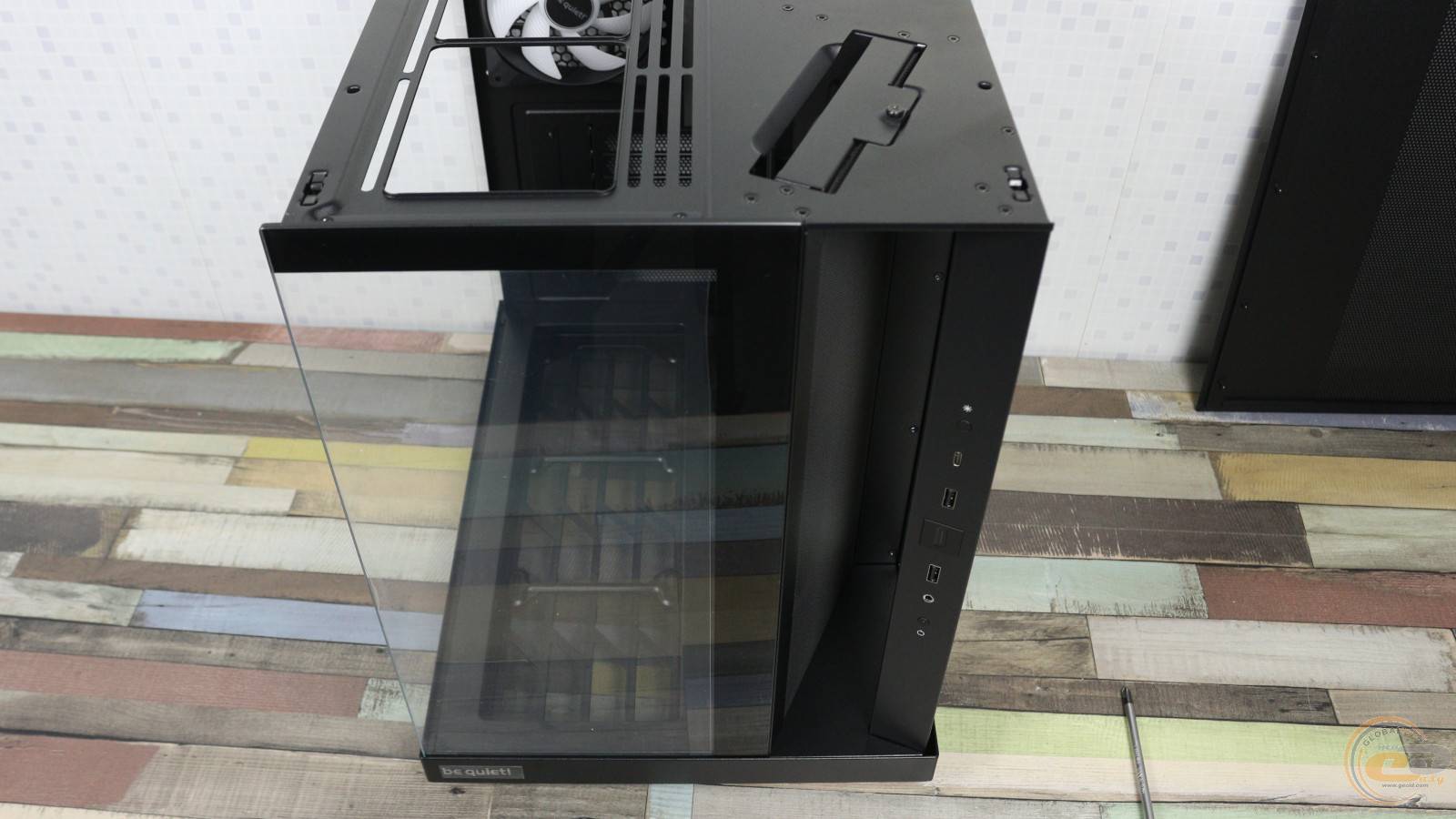 Передня панель майже повністю виконана із загартованого скла товщиною близько 3 мм, під яким розташовано блискучий логотип be quiet!.