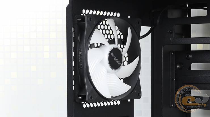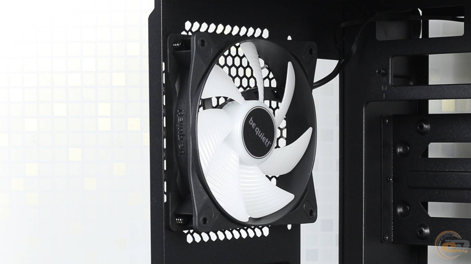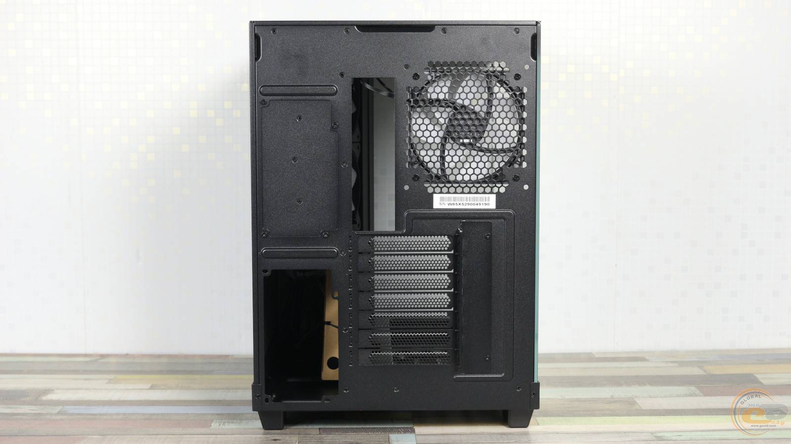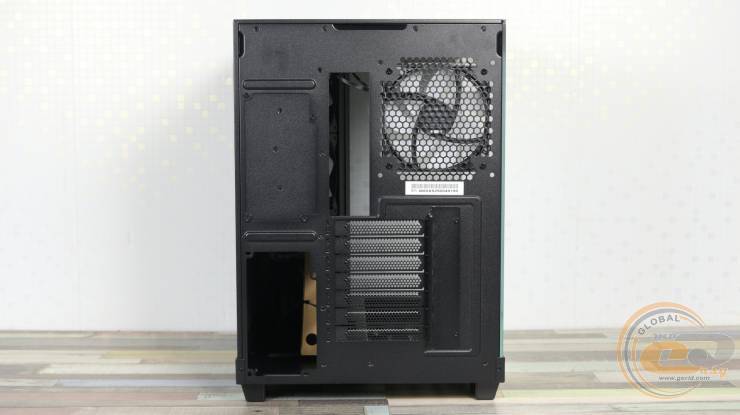 На тильній стороні корпуса праворуч можна побачити посадкове місце для одного 120-мм чи 140-мм вентилятора, де виробником встановлено 120-мм Light Wings LX PWM із підтримкою ШІМ-регулювання швидкості обертання до 1600 об/хв із максимальним рівнем шуму до 25,5 дБ(А) включно.