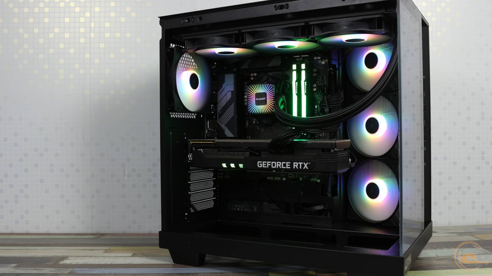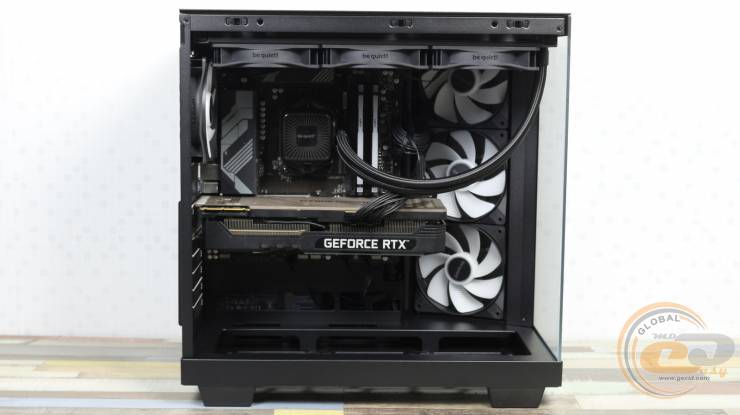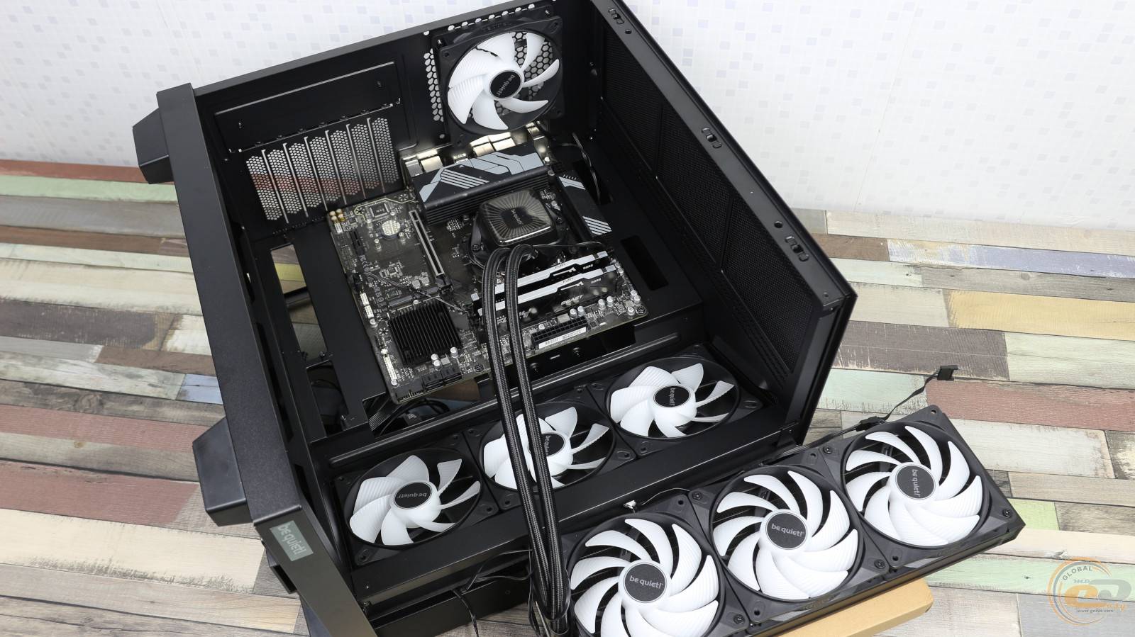Температура повітря в приміщенні тестової лабораторії на момент проведення вимірювань становила 21°С. За охолодження компонентів у корпусі be quiet! Light Base 500 LX відповідали процесорна РСО be quiet! Pure Loop 3 LX 360mm та чотири корпусні вентилятори. Тильний вентилятор працював зі швидкістю 1600 об/хв, а ті, що розміщені на бічній панелі були обмежені до 1300 об/хв. Вертушки, що встановлені на радіаторі РСО, працювали на свій максимум та досягали позначки у 2100 об/хв.
