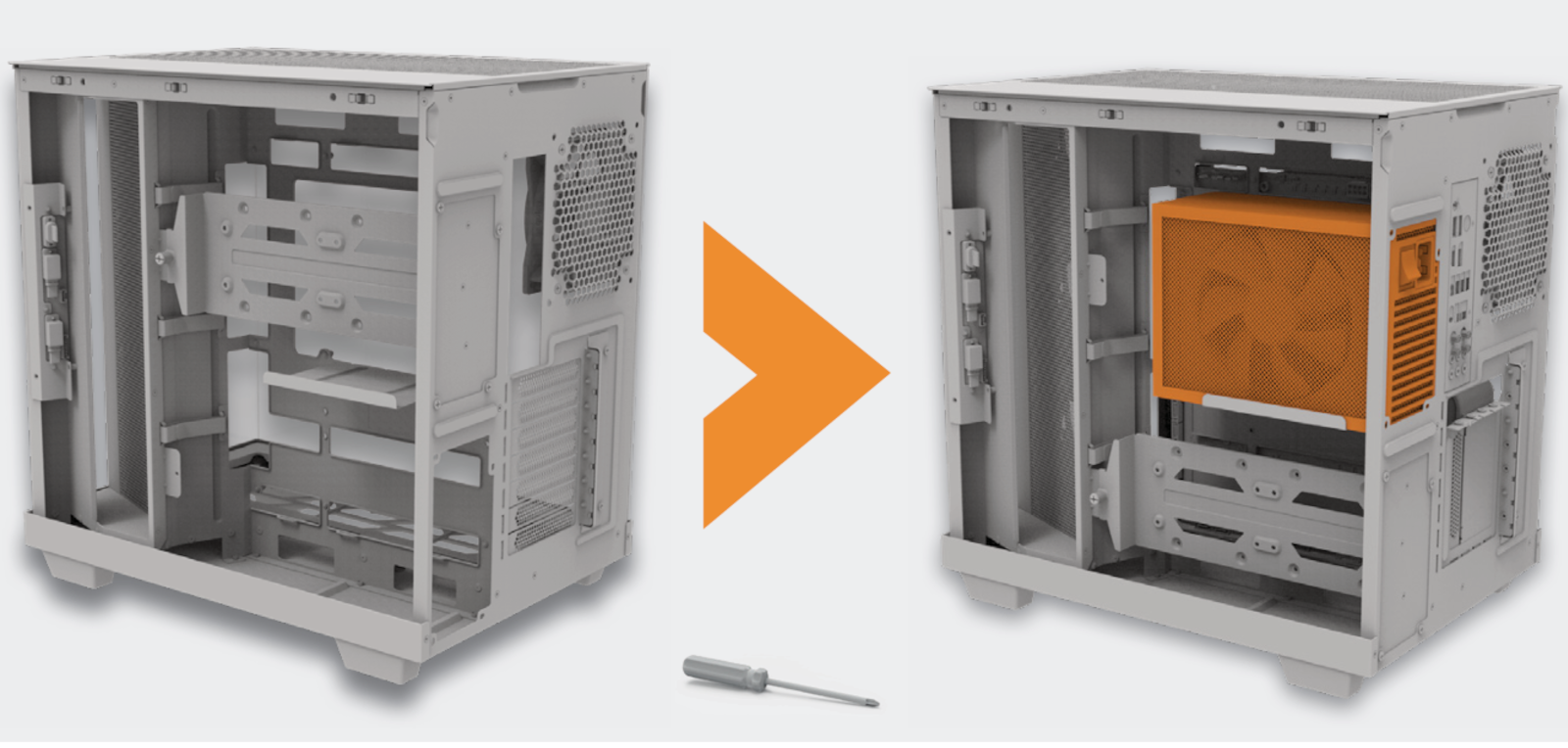 Один 3,5″ жорсткий диск та два SSD кріпляться гвинтами на обидва боки знімної панелі, що знаходиться вище стандартного місця для монтажу блока живлення.