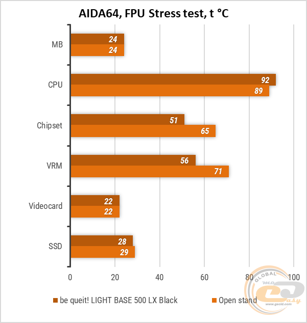 У стрес-тесті AIDA 64 Stress FPU різниця між температурою процесора всередині корпуса та на відкритому стенді становила лише 3°C. Натомість ключові вузли материнської плати при знаходженні у корпусі, навпаки, виявились відчутно холоднішими за рахунок їх додаткового охолодження вентиляторами.