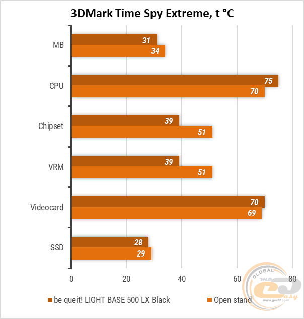 У бенчмарку 3DMark Time Spy Extreme ситуація для процесора та відеокарти виявилась подібною. Порівняно з відкритим стендом вони показали температури більше на 5°C та 1°C відповідно.