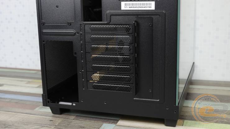 Нижче розмістились сім слотів розширення, закритих багаторазовими перфорованими заглушками. Якщо виникне потреба вертикально встановити відеокарту, цю панель можна замінити на комплектну. Але райзер-кабель для під’єднання відеоадаптера доведеться придбати окремо.