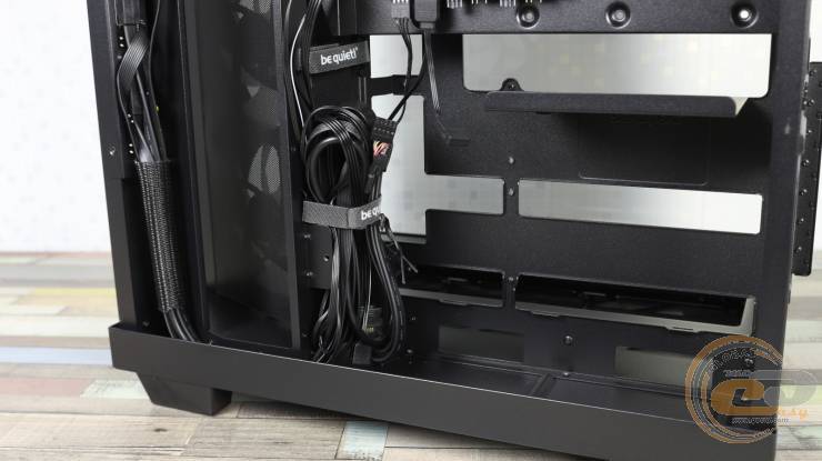 Піддон материнської плати віддалений від правої боковини на 90 мм. Але якщо рахувати від кронштейна для встановлення накопичувачів – наявний простір зменшується до 30 мм. Цього буде більш ніж достатньо для розміщення усіх необхідних кабелів. А красиво їх згрупувати допоможуть одноразові стяжки, що входять до комплекту постачання, та три завбачливо встановлені виробником стяжки-липучки.