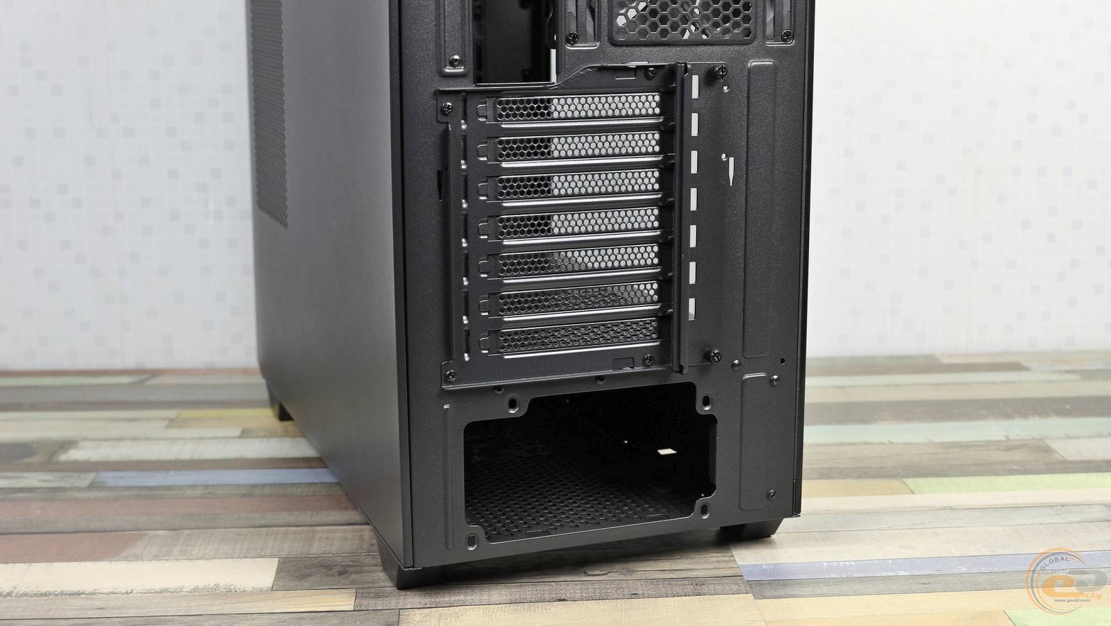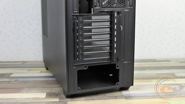 Нижче розташовано сім слотів розширення із багаторазовими заглушками. Усі вони перфоровані, а пристрої тут додатково фіксуються спільною притискною пластиною. Чотири монтажні отвори внизу CHIEFTEC Night Hunter GS-03B-BLK-OP дозволяють встановлювати блок живлення лише одним способом — вентилятором донизу.