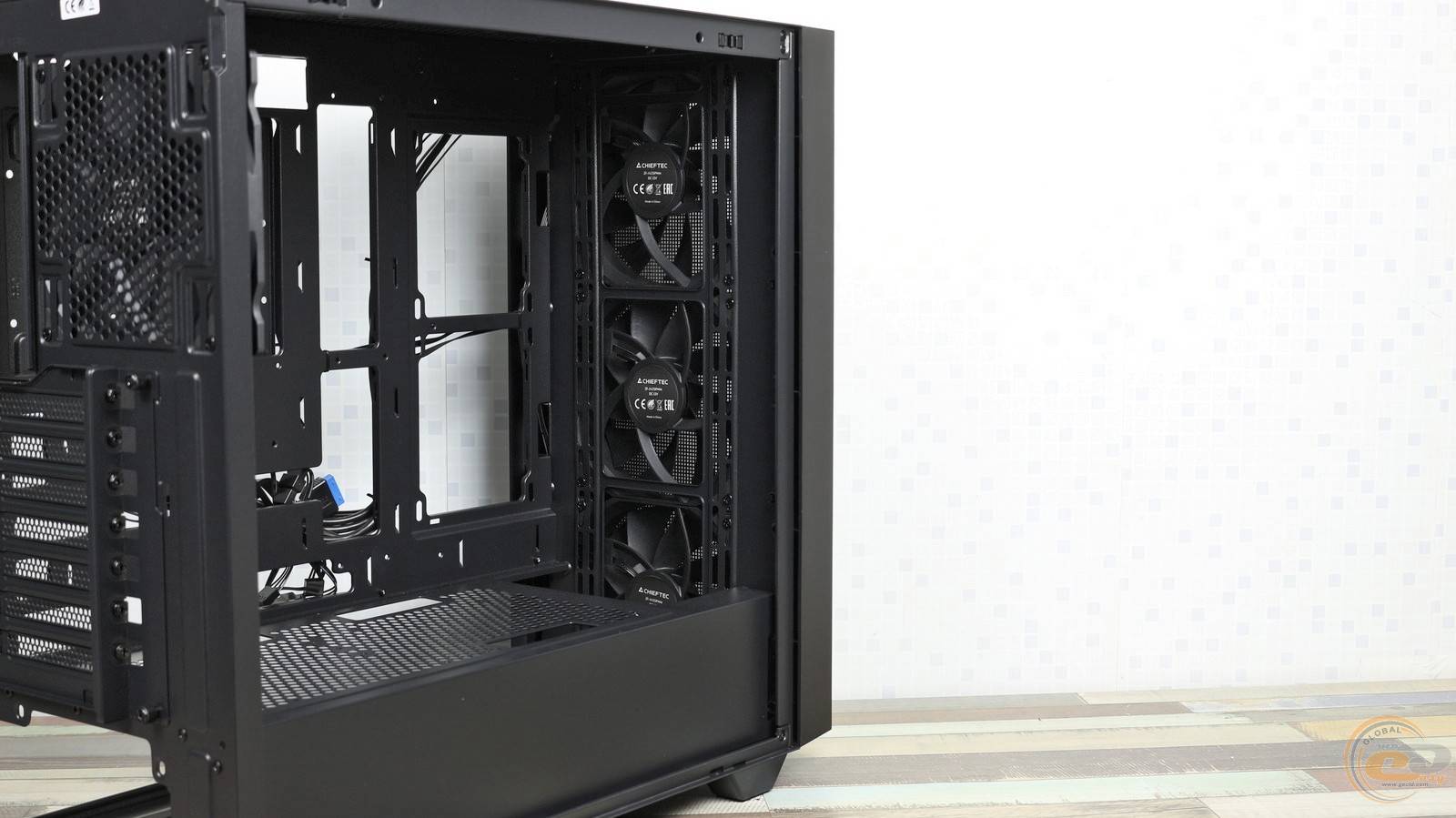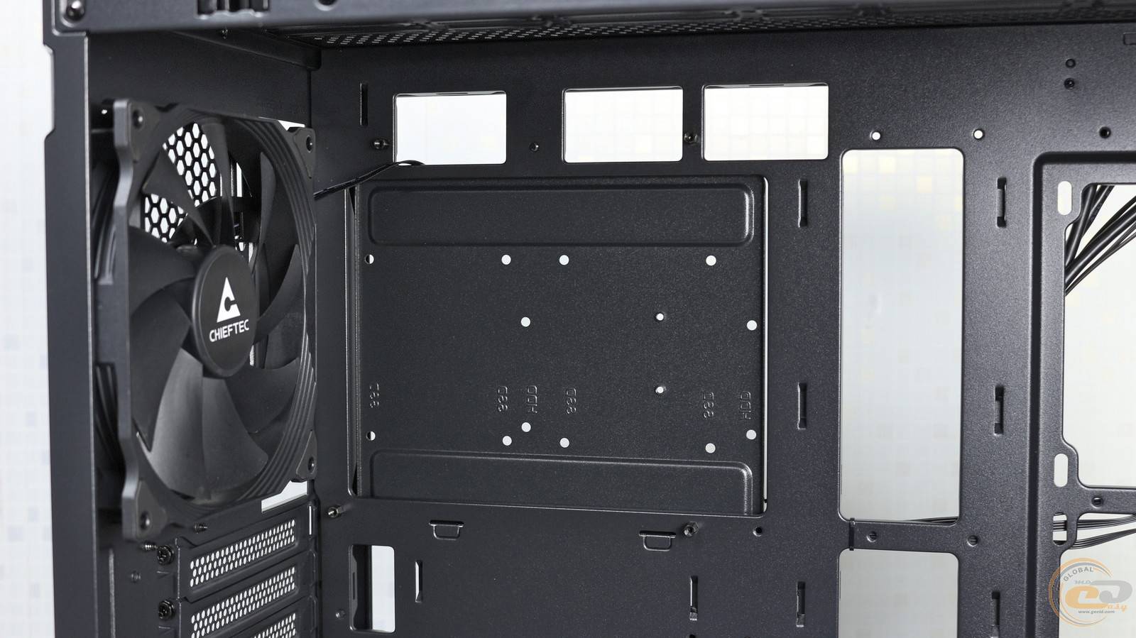 Позаду неї розташований великий знімний пиловий фільтр, який подбає про чистоту всередині системника. Ще глибше встановлено три 140-мм вентилятори CHIEFTEC ZF-1425PWM — вони помітно ефективніші за звичні 120-мм моделі. Підсвітки тут немає, зате є підтримка ШІМ-регулювання швидкості до 1100 об/хв і антивібраційні прокладки по краях. А в основі кожного вентилятора використовується надійний гідравлічний підшипник.