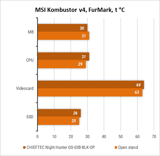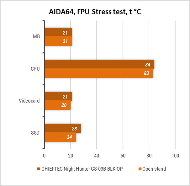 У FPU Stress Test в AIDA64 різниця у нагріванні компонентів усередині системника й на відкритому стенді практично відсутня. Винятком став лише SSD, який розташований позаду піддона і тому отримує небагато прохолодного повітря.