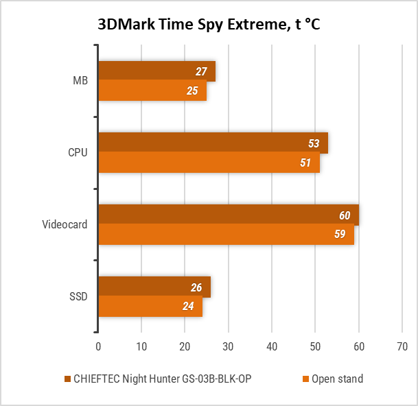 В 3DMark Time Spy різниця у температурах материнської плати та процесора зросла до 2°C — а це все ще зовсім незначний показник.