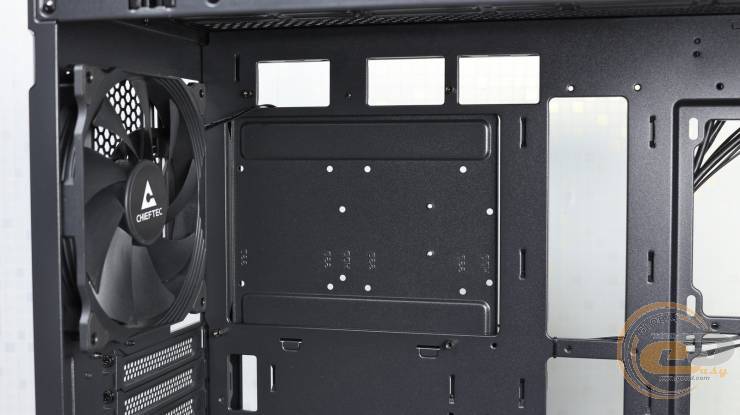 Насправді він є - просто з тильного боку його закриває кронштейн для пари накопичувачів. До речі, дуже раціональне використання внутрішнього простору.