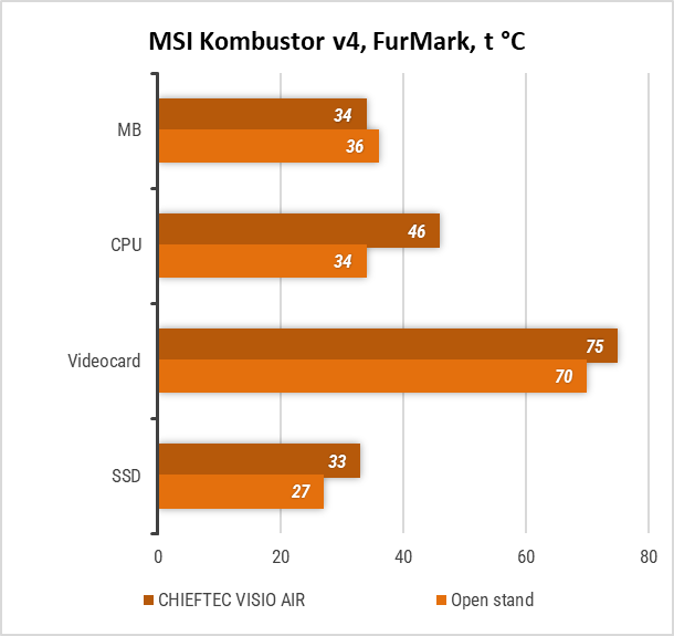 Навантаження тестом FurMark у MSI Kombustor v4 призвело до підвищення температури відеокарти на 5°С у корпусі, порівняно з відкритим стендом.