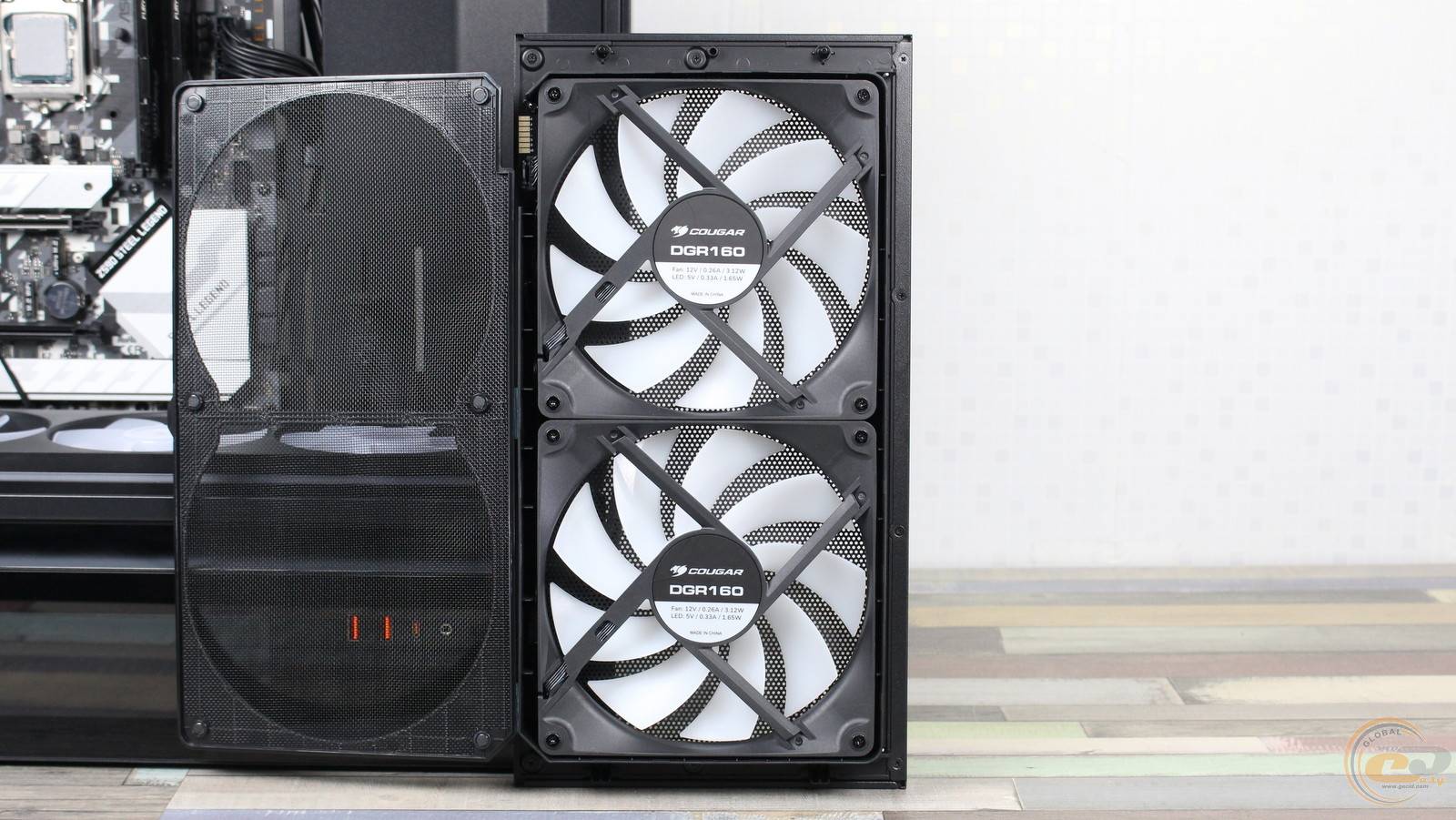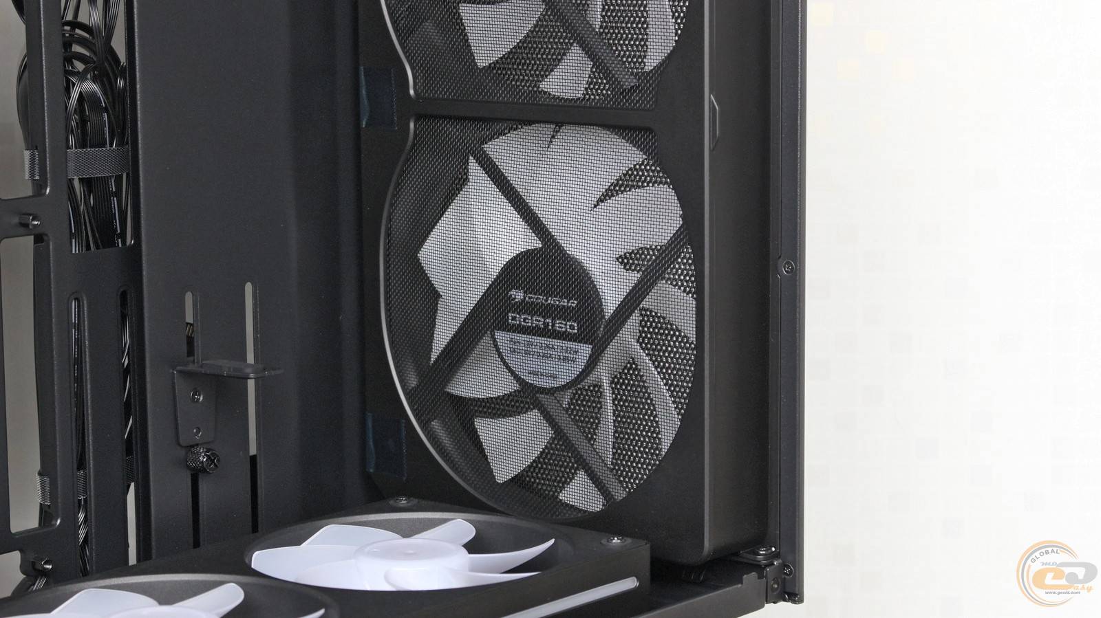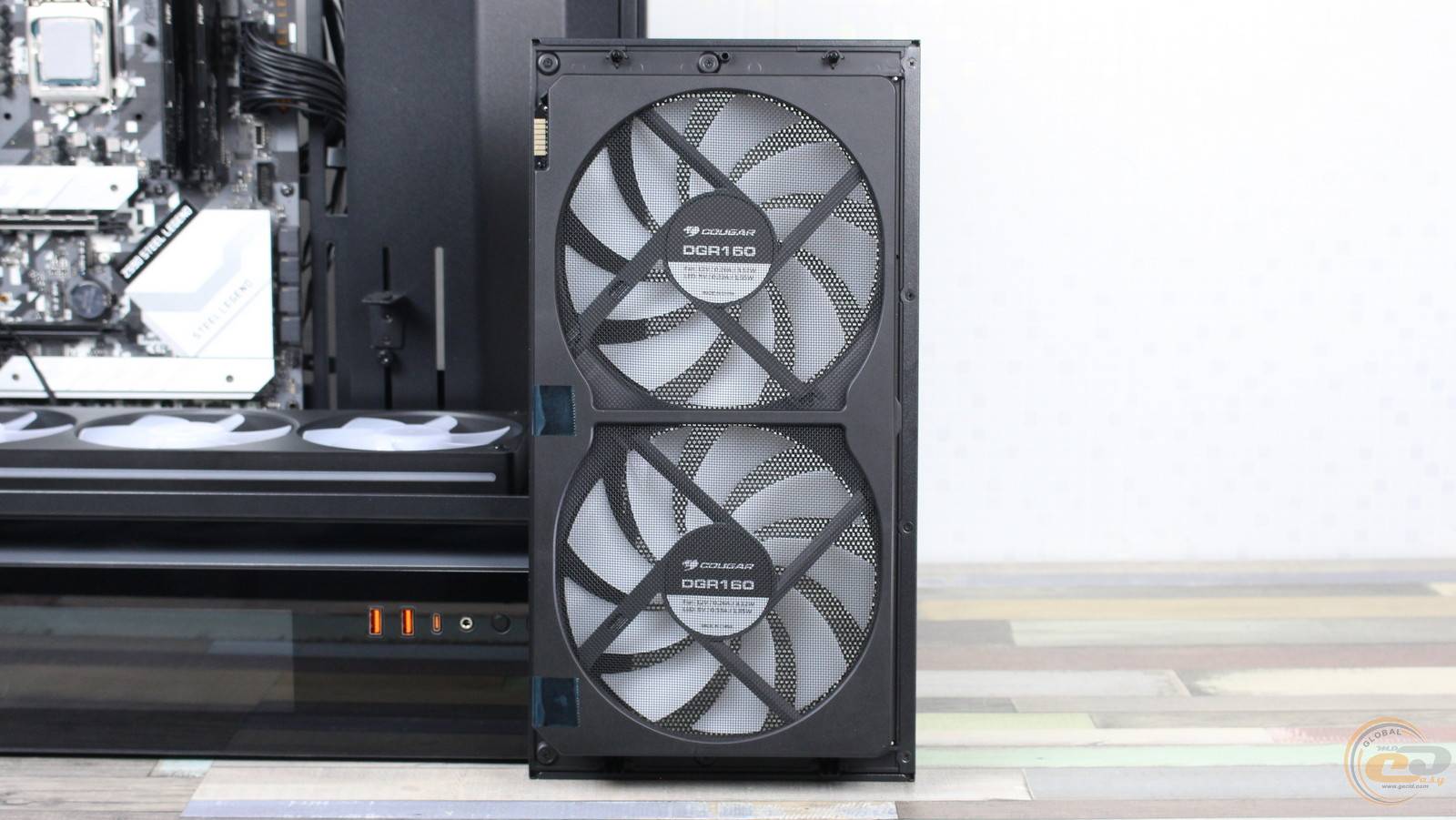 Останній тримається на шести магнітах і додатково зафіксований клейкими стрічками. Під ним можна роздивитися вертушки Cougar DGR160, які отримали світлі лопаті, ARGB-підсвітку та ШІМ-регулювання швидкості обертання у межах від 500 до 1200 об/хв. Щодо енергоспоживання, то електродвигун потребує до 3,12 Вт (0,26 А при 12 В), тоді як світлодіоди — до 1,65 Вт (0,33 А при 5 В).