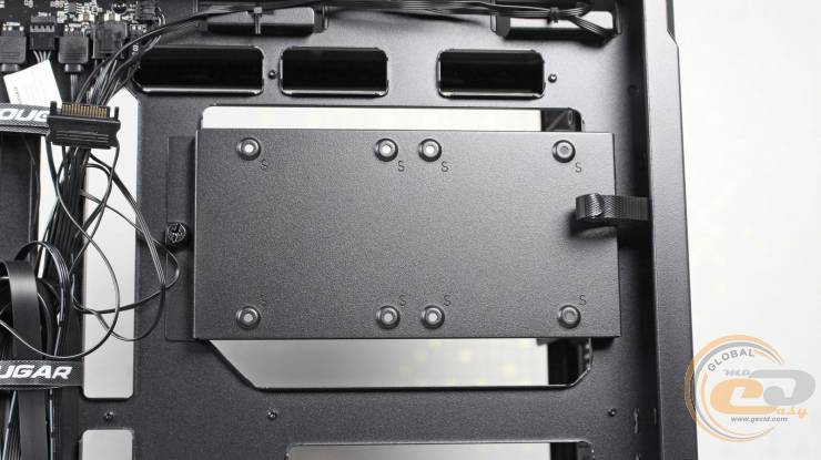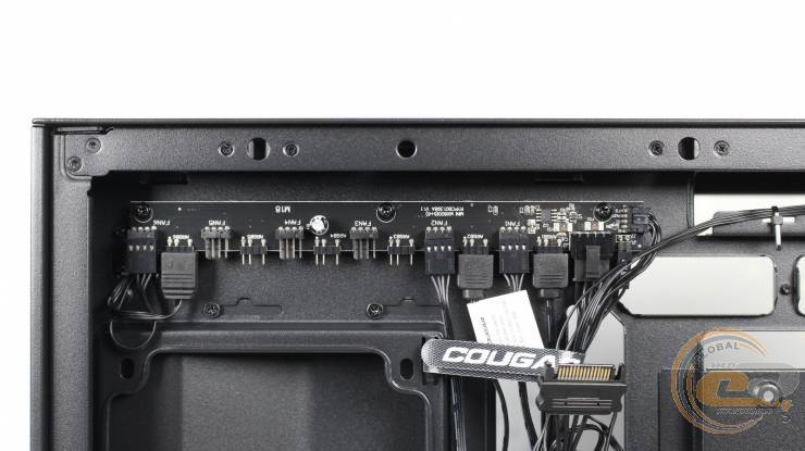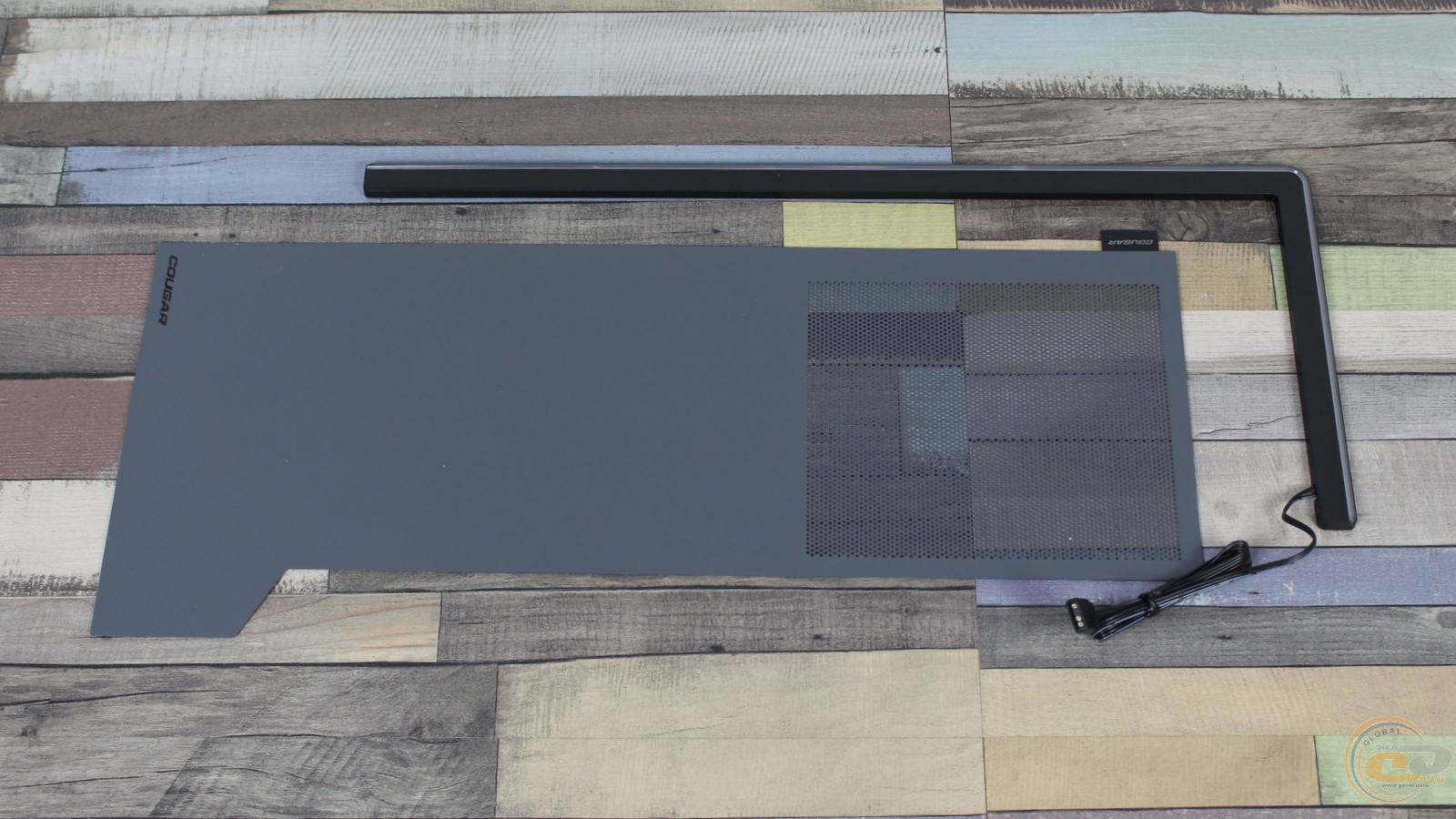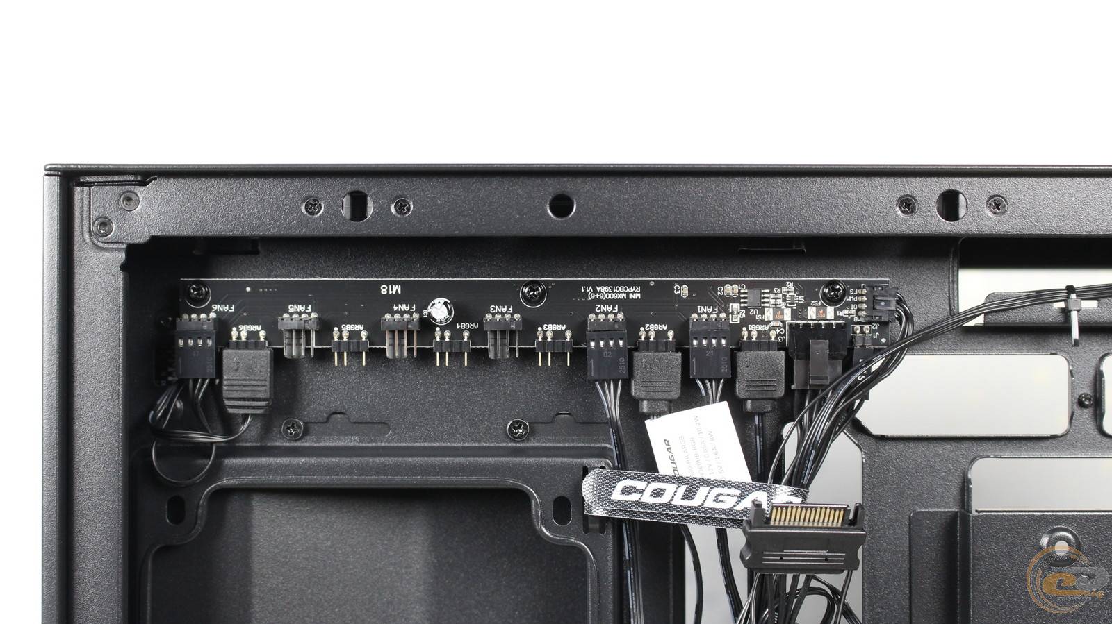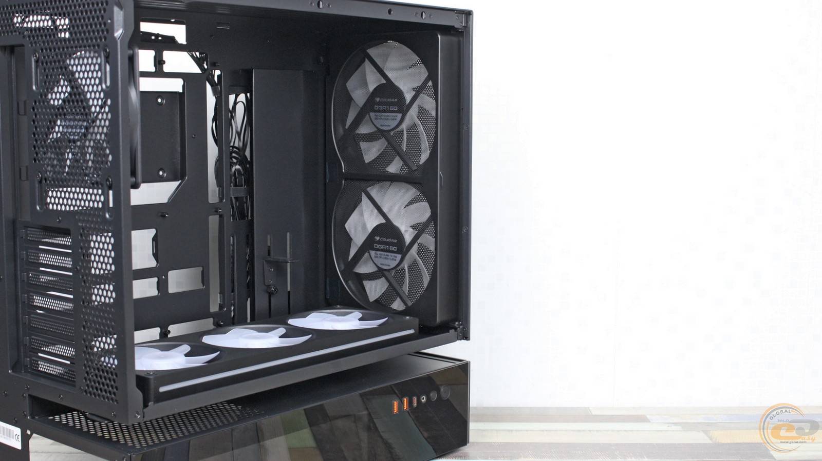 Останній тримається на шести магнітах і додатково зафіксований клейкими стрічками. Під ним можна роздивитися вертушки Cougar DGR160, які отримали світлі лопаті, ARGB-підсвітку та ШІМ-регулювання швидкості обертання у межах від 500 до 1200 об/хв. Щодо енергоспоживання, то електродвигун потребує до 3,12 Вт (0,26 А при 12 В), тоді як світлодіоди — до 1,65 Вт (0,33 А при 5 В).