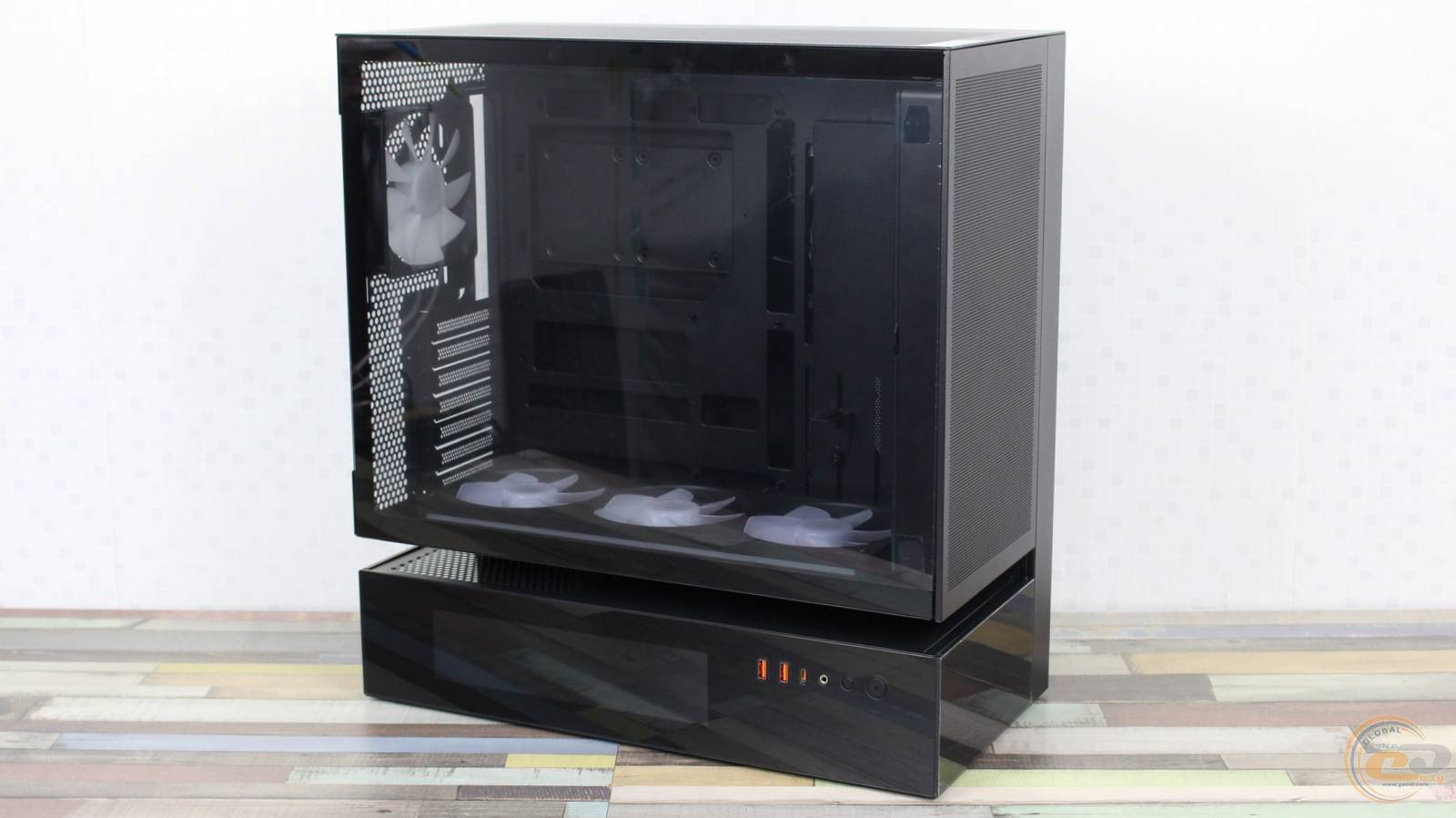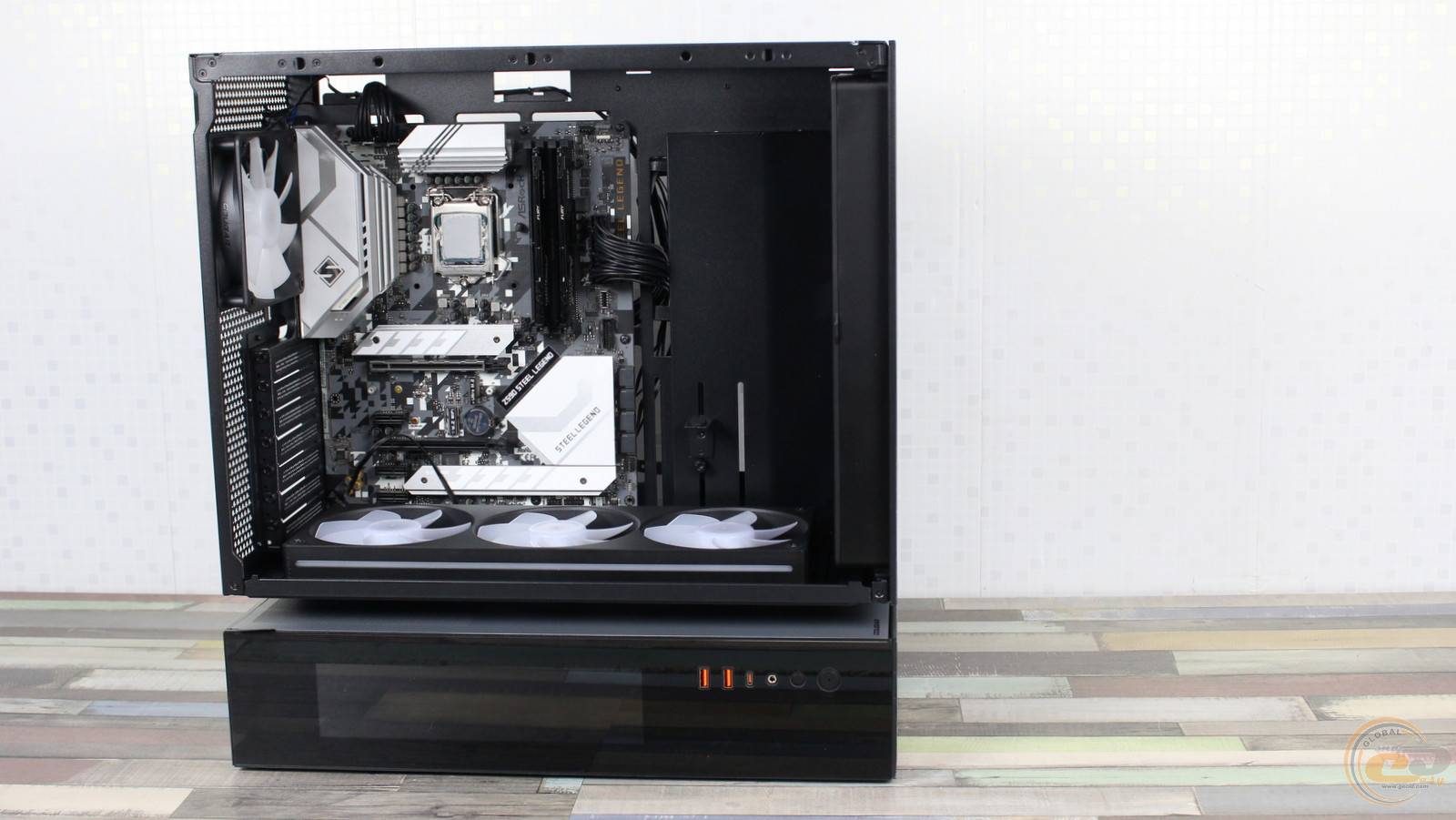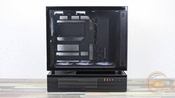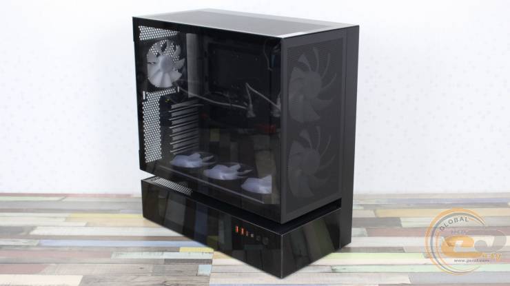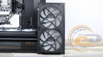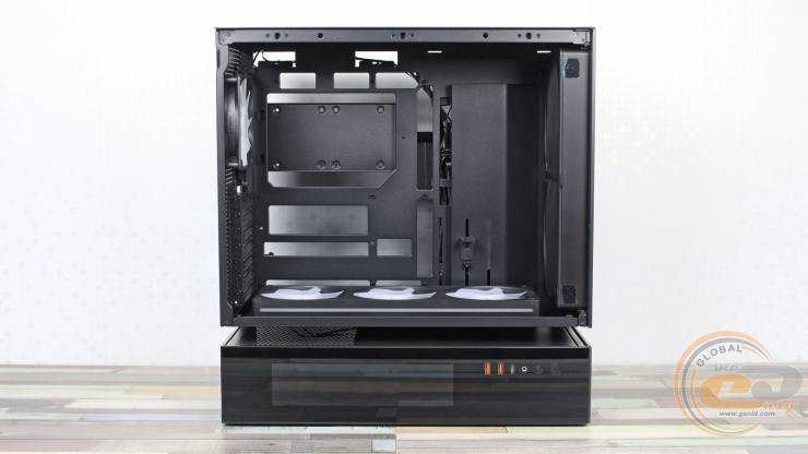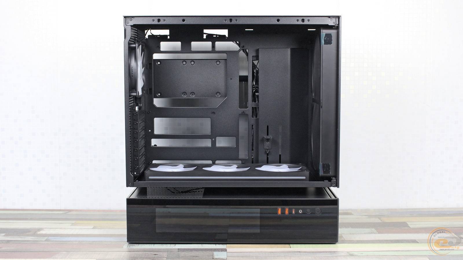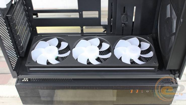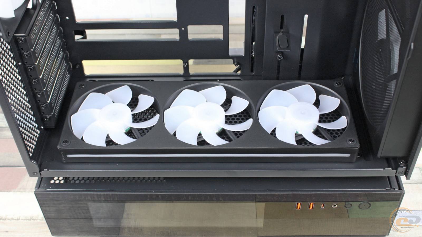 На дні видно набір із трьох 120-мм пропелерів у спільній рамці — Unity 360 ARGB PWM. Їх наявність тут повинна забезпечити хороший потік повітря знизу, чого бракує корпусам зі звичним компонуванням. Швидкість обертання цієї трійці змінюється ШІМ-методом в межах від 700 до 1600 об/хв. Фіксується така конструкція всього чотирма гвинтами, а для подачі живлення та підсвітки є по одному конектору. Втім, такий підхід має і свої мінуси — при виході з ладу одного з вентиляторів замінювати доведеться весь блок.