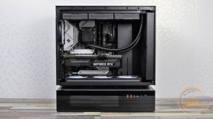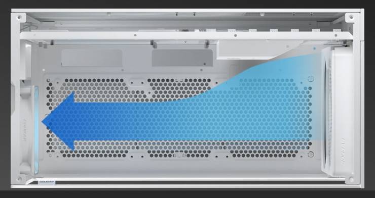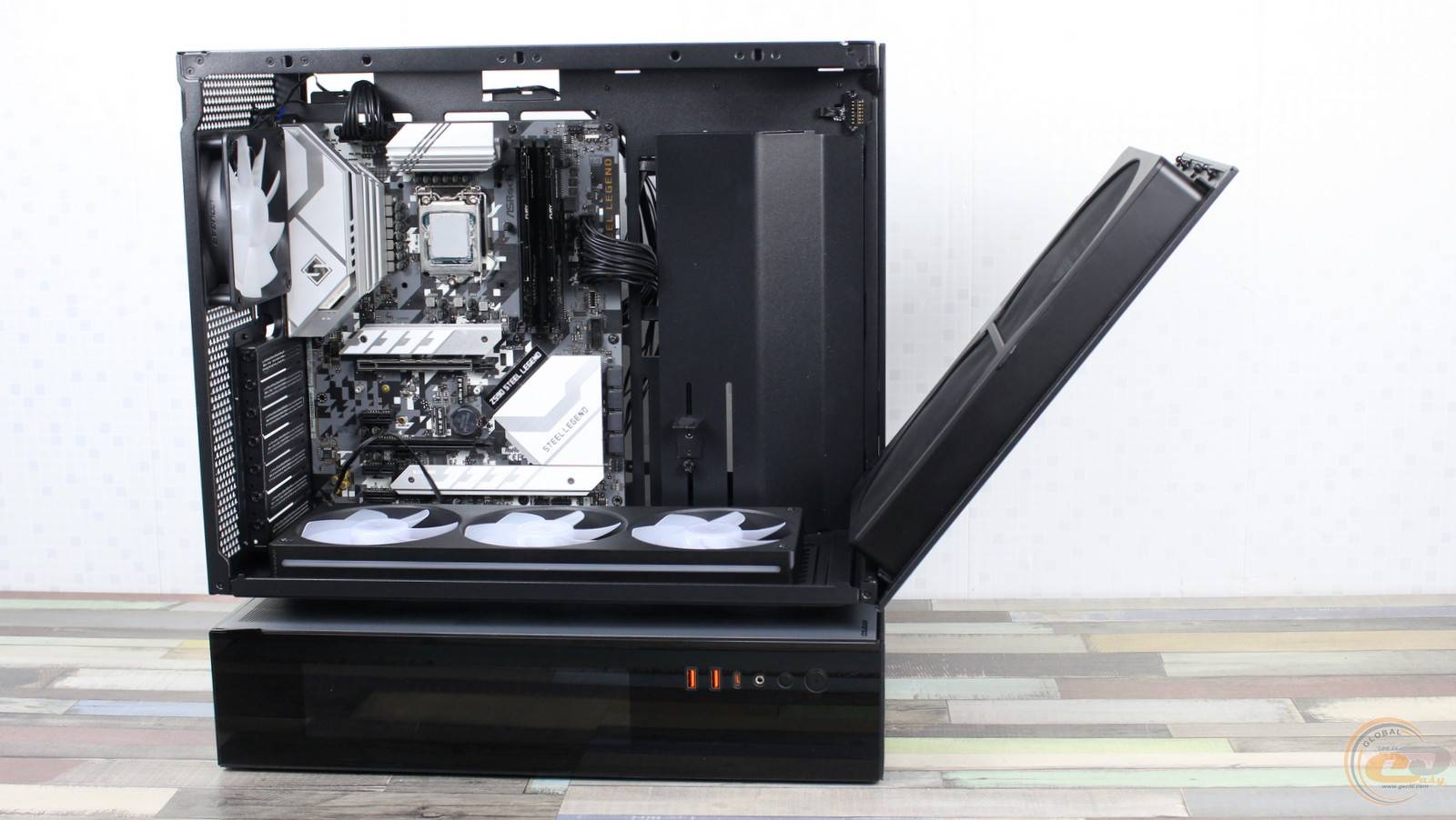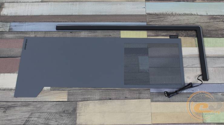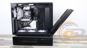 Праворуч розташована вигнута металева панель, покликана скеровувати повітряний потік на найгарячіші компоненти. На ній, своєю чергою розміщено кронштейн для підтримки габаритної відеокарти з регулюванням по висоті. А щоб така конструкція була сумісною з адаптерами різної довжини, вертикальну пластину можна посунути ближче до материнської плати.