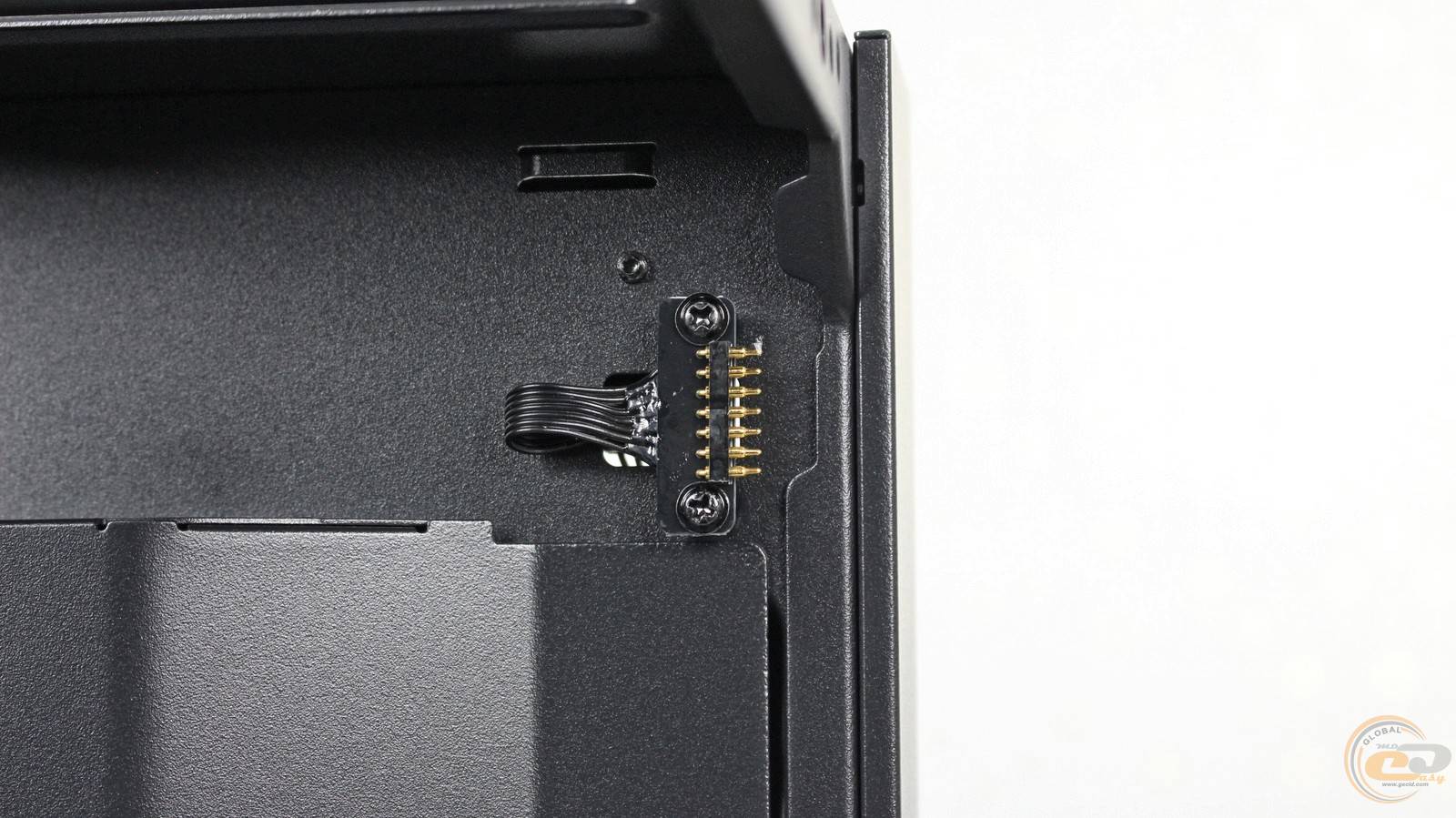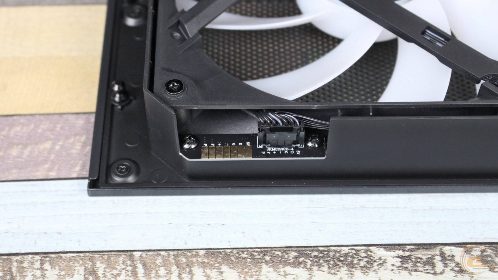 У лівому куті встановлено плату-хаб із дуже зручним доступом, розраховану на під’єднання до шести вентиляторів із ARGB-підсвіткою і комплектної LED-стрічки. Живлення плати здійснюється через 40-см конектор SATA, а перемикання вісімнадцяти пресетів підсвітки — за допомогою кнопки на бічній панелі. Так, коротке натискання послідовно змінює режими, утримання протягом 3 секунд — вмикає синхронізацію світіння з материнською платою, а протягом 6 секунд - повністю вимикає підсвітку.