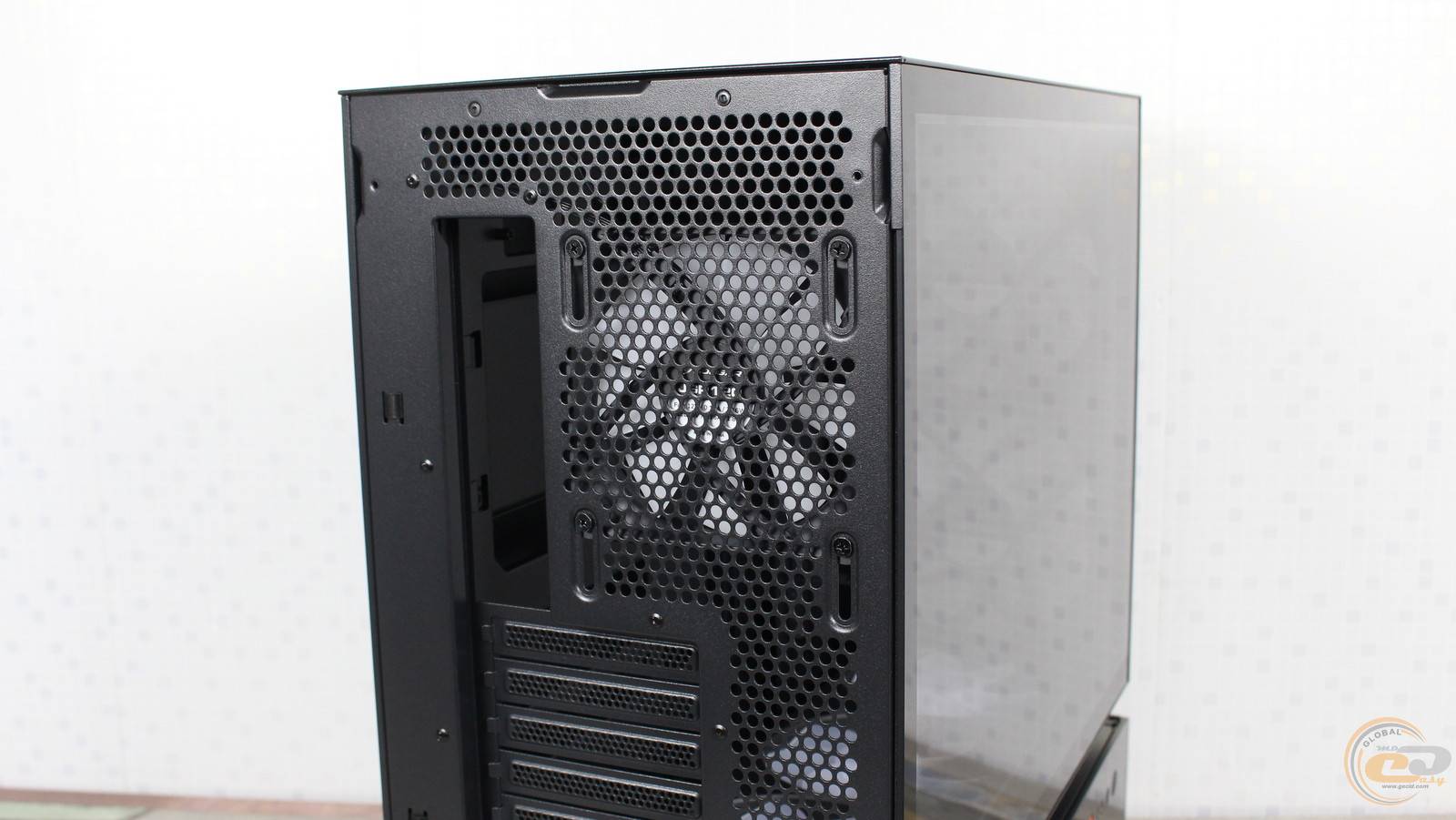 Що ж до тилу COUGAR CFV235 Mesh Vision Black, то його компонування доволі звичне. Праворуч зверху розташований 120-мм вентилятор з можливістю регулювання положення по висоті. Його світлі лопаті натякають на наявність LED-підсвітки, а швидкість регулюється в межах від 500 до 1400 об/хв.
