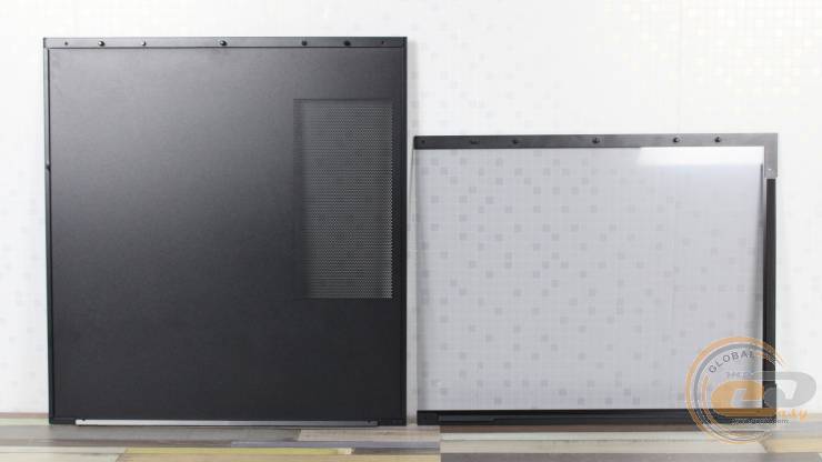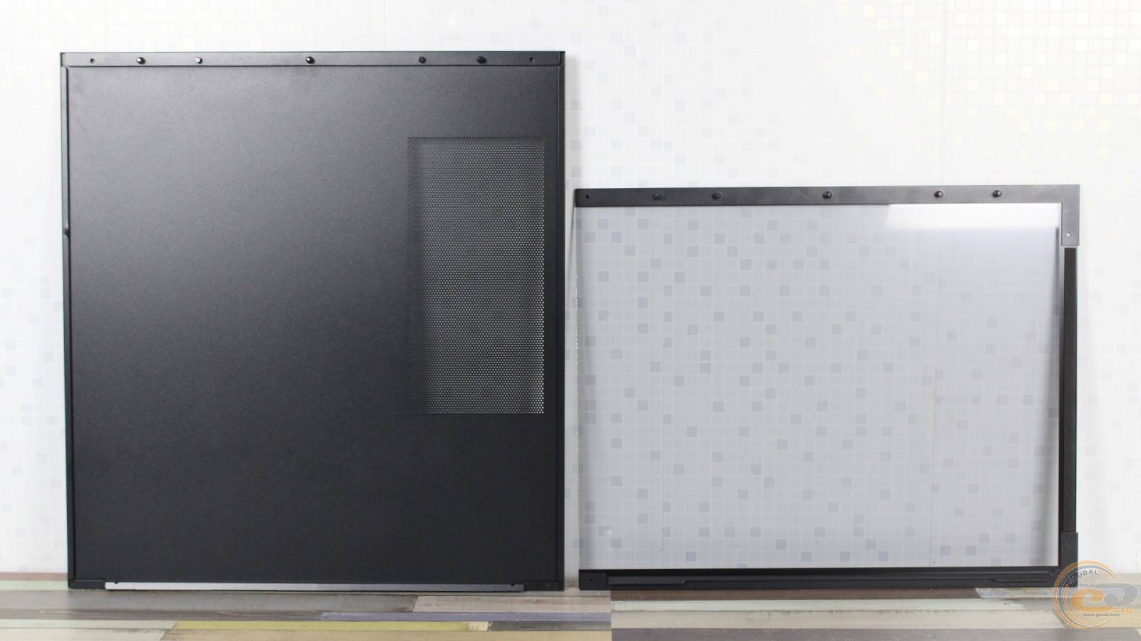 Фіксація панелі здійснюється безгвинтовим способом за допомогою штирів у верхній частині та напрямної планки знизу. Аналогічним чином реалізоване і кріплення 3-мм скляної боковини.