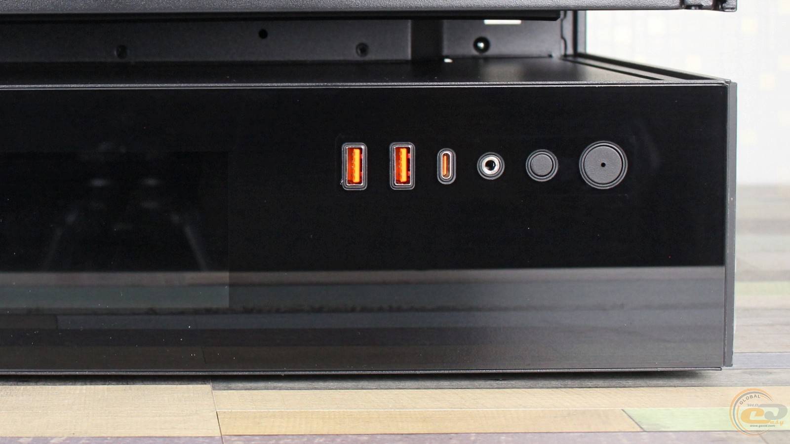 Помаранчеві підкладки USB-портів привабливо виглядають на чорному тлі. Таким чином позначено 20-гігабітний USB 3.2 Gen 2x2 Type-C і пару 5-гігабітних USB 3.0 — відмінний набір для під’єднання різноманітних девайсів. Поруч є комбінований 3,5-мм аудіопорт, а також кнопки керування LED-підсвіткою та увімкнення з вбудованим індикатором живлення — обидві мають короткий і чіткий хід.