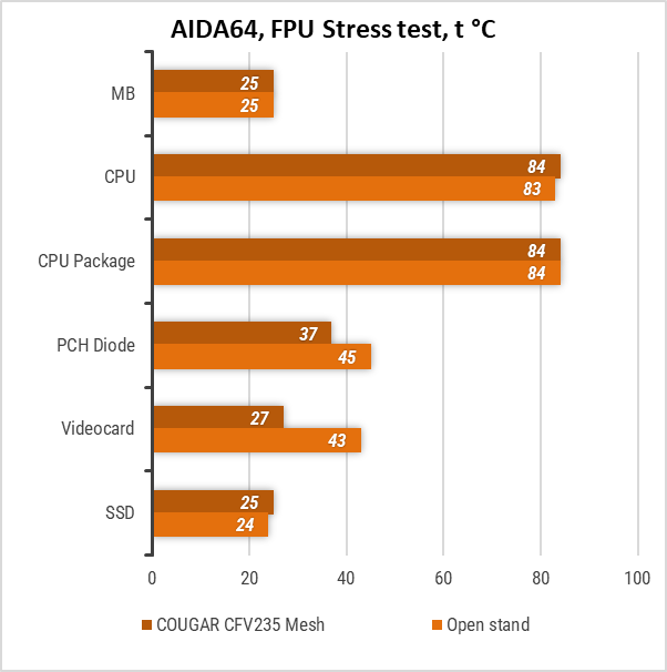 У FPU Stress Test в AIDA64 різниці в нагріванні процесора у корпусі та на відкритому стенді практично не було. Це ж стосується і температури материнської плати. Зате чипсет та відеокарта виявилися на суттєві 8-16°C холоднішими якраз всередині корпусу — активне обдування дається взнаки.