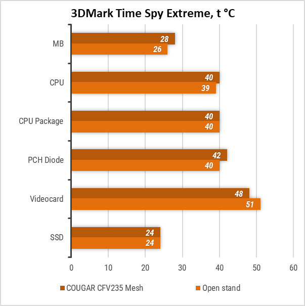 У бенчмарку 3DMark Time Spy результати дуже схожі — різниця досягає не більше 3°C на користь то одного, то іншого сценарію використання.